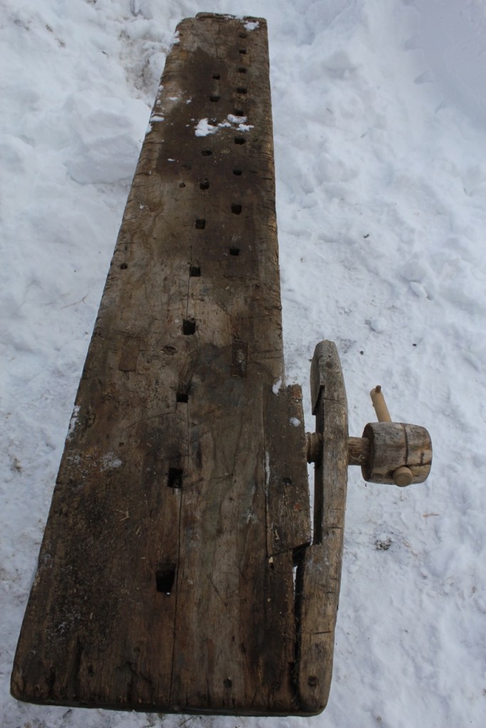 Previous Image Next Image IMG_4479 Framtang i bjørk, med hengsel i hjørnet, nytt håndtak til å stramme med (spilspik?)