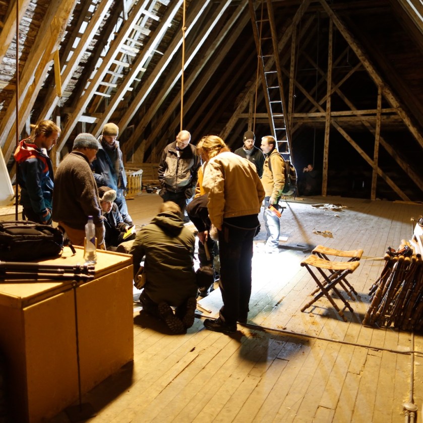På samlinga i faget tømring var vi på befaring på loftet på Trondarnes kyrkje. Her oppdaga vi nokre stokkar med spennande nover. Desse vart undersøkt og dokumentert med tanke på prøvetømring. Foto: Roald Renmælmo