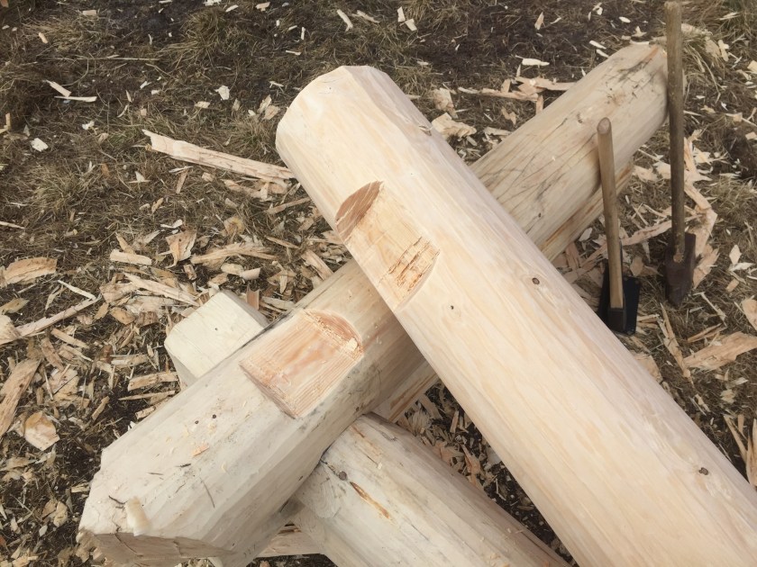 Previous Image Next Image Figur 9 Figur 9. Her er det hugget ut en «liggeflate» i over- og understokken slik at de kan ligge stabilt mot hverandre mens noven på overstokken hugges. Foto: Henrik Jenssen.