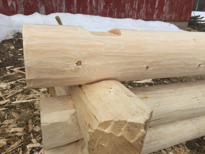 Previous Image Next Image Figur 10 Figur 10. Nå ligger stokkene mot hverandre og den tredje flaten som er et direkte steg i noven på undersiden av overstokken er hugget ferdig. Foto: Henrik Jenssen.