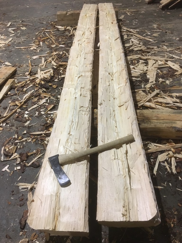 Midtplanken er kløyvd til to bord. Denne stokken hadde litt urolig marg og gankvist så kløyven kunne vore betre. Det er likevel ikkje verre enn at det blir to fine sutaksbord av denne stokken. Av bakane blir det også nokre emne til veggtiler til drombegangen til gjesteloftet. Foto: Roald Renmælmo