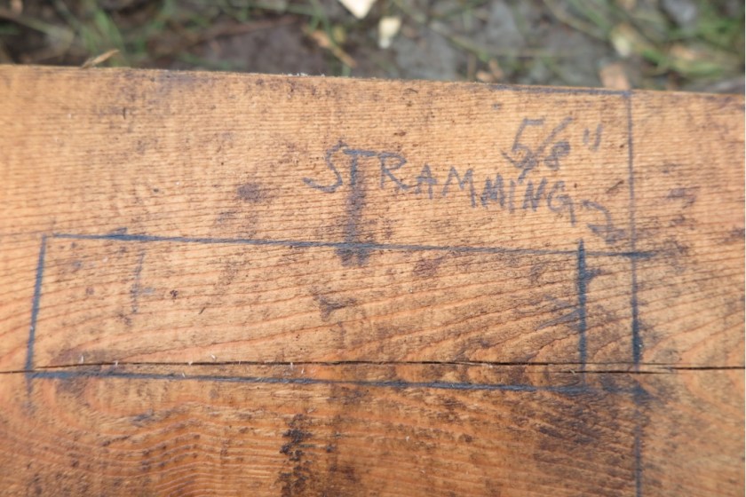 Ved å forskyve tappholet gjer ein det litt trongt for strevaren. Her er stramminga på 5/8”. Det nedre tappholet forskyvast 5/8” inn. På biletet synast den opphavelege merkinga og ny strek.