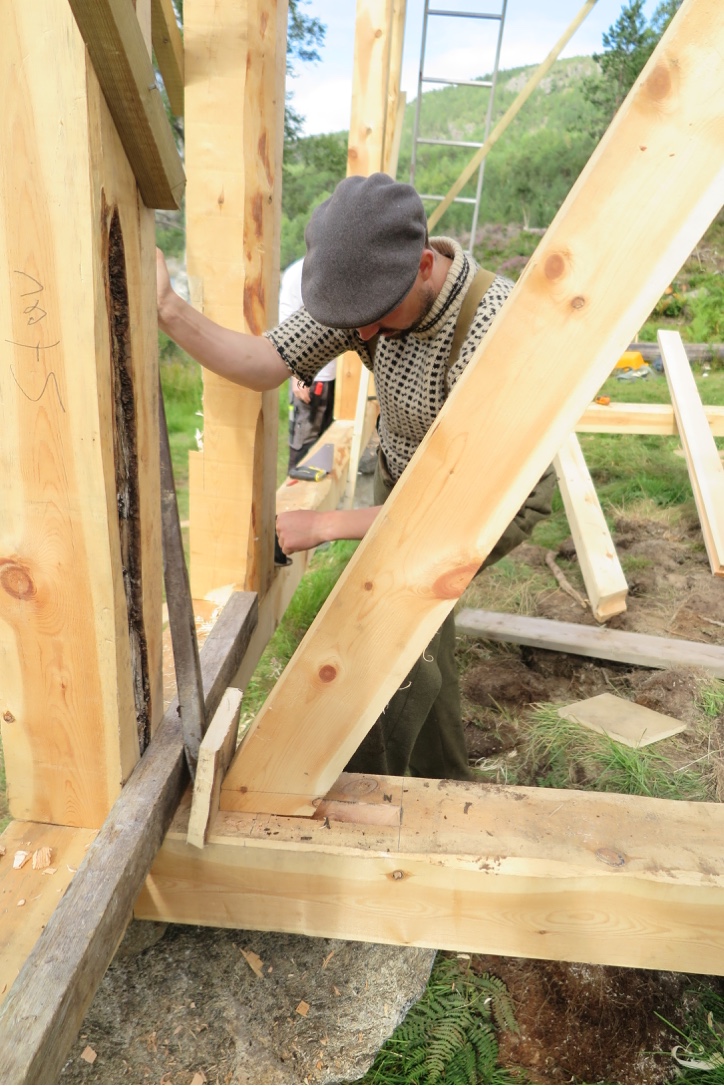 Strevaren settast inn i tappholet i toppen fyrst. For å få den nedre enden inn i tappholet nytta me spett og vågemat. På dette tidspunktet i byggeprosessen er det ingenting som held raftomfaret nede. Når strevaren vert lagt inn med stramming vil rafta lyfte seg litt. Det kan ein sjå ved at det vert glippe mellom stav og raft.