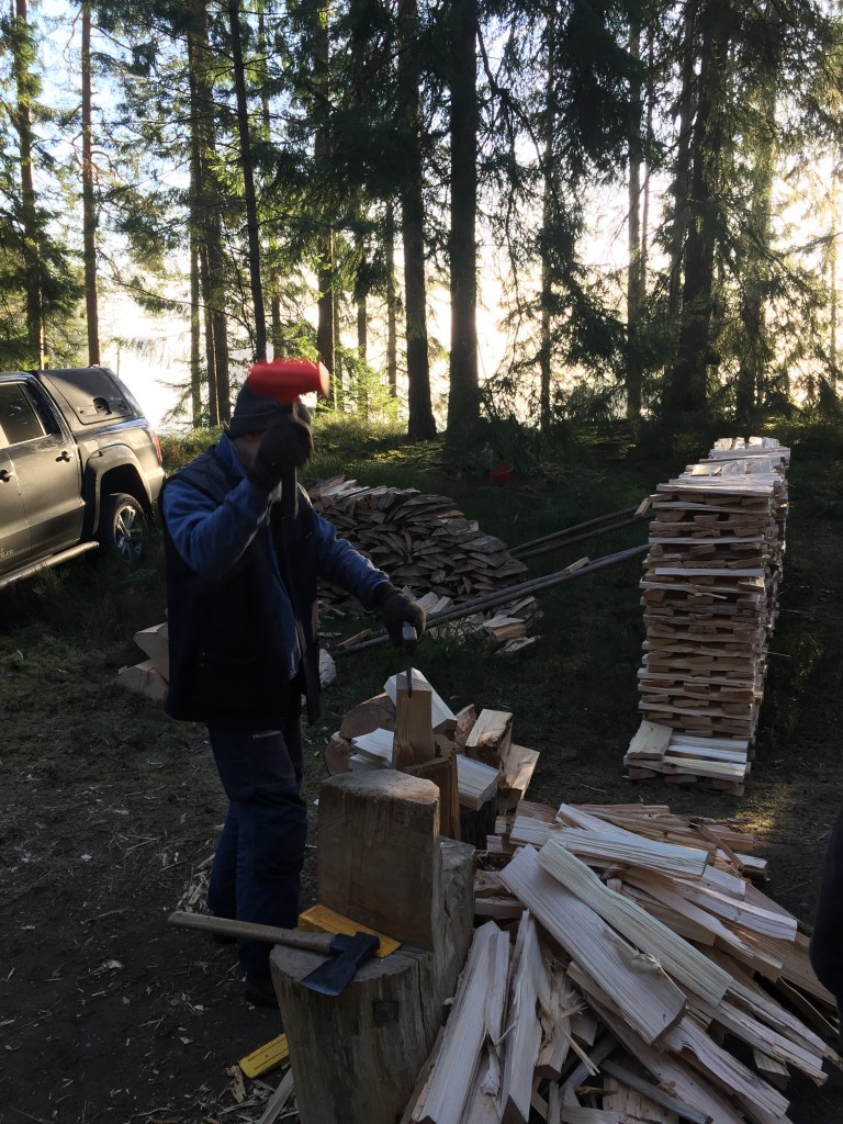 Her kløyver Børje ut sponemnene med en svensk ryarbile med kort skaft, snekkerøksen brukte han til å kante sponemnene med,. Han var nøye med lagringen og stablingen, slik at all spon lå med rettkanten (der han startet kløyven) bort fra sola