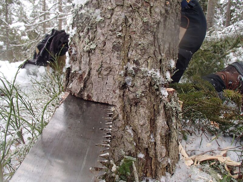 Previous Image Next Image 0004 Det meste blei fellt med motorsag, men øksa og svansen blei også brukt. Foto Henning Jensen
