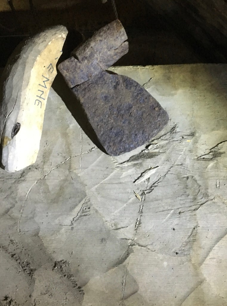 Previous Image Next Image fullsizeoutput_9bd Øks funne i same naustet som bordet med glepphogging. Eggfasongen kan passe ganske bra med øksespora på bordet. Foto. Roald Renmælmo