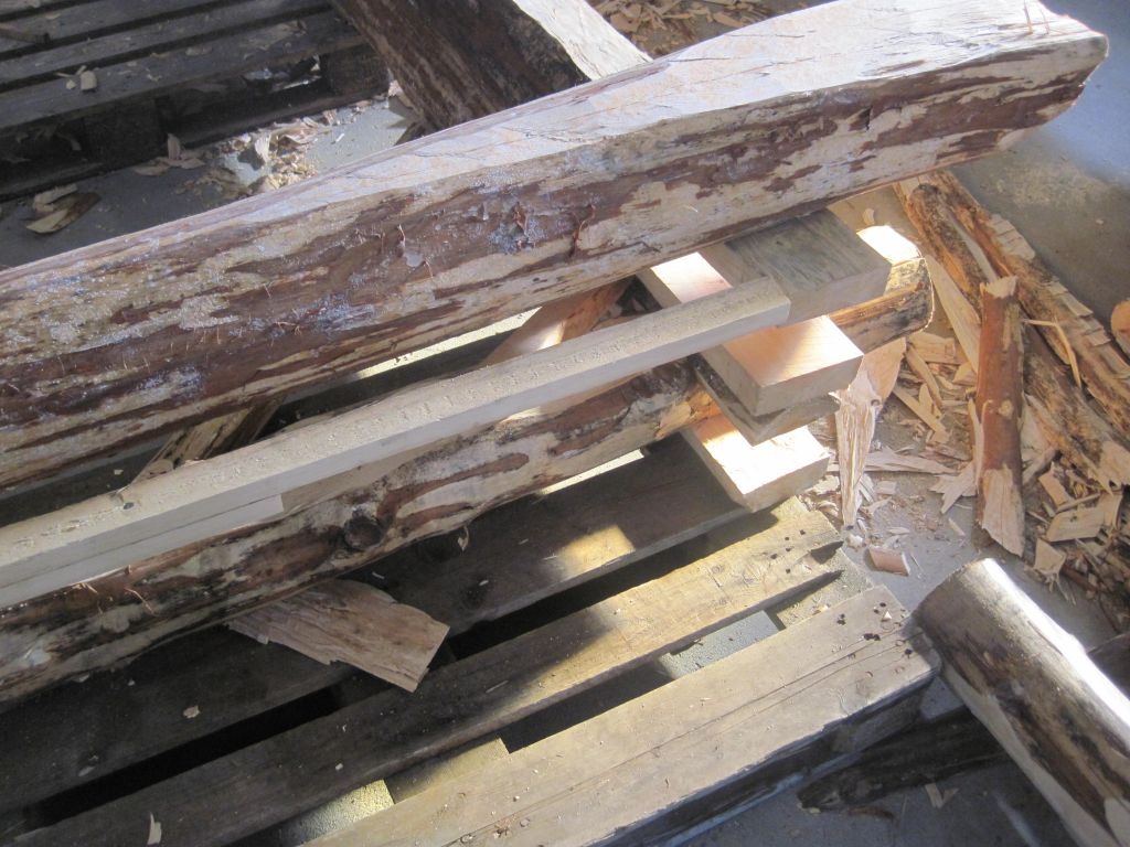 Når langveggene var ferdige plukket vi dem ned og gikk i gang med å hogge sammen reiså. Vi brukte en lekte som mal på avstanden opp ved øyrene og vinklet staven. Merket så øyrene over på slindrene.