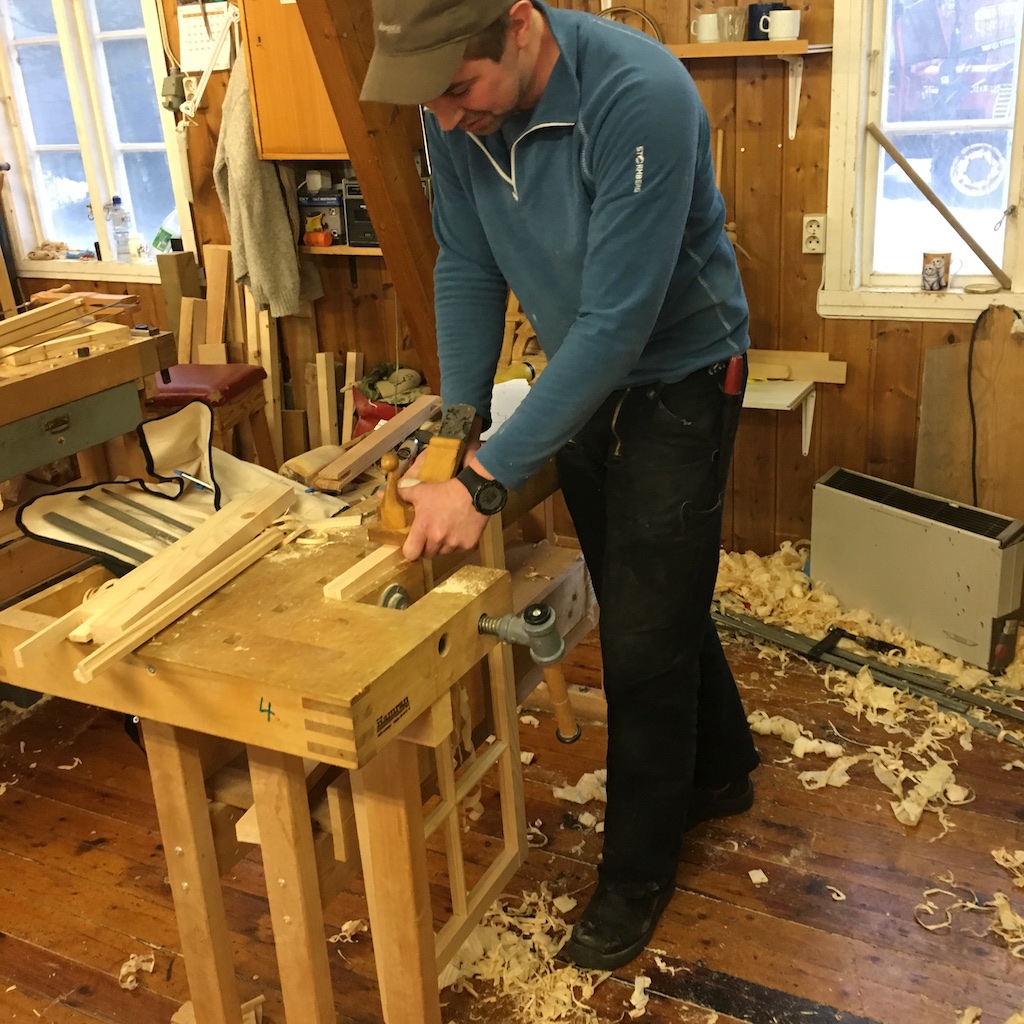 Sven i arbeid med å høvle material.