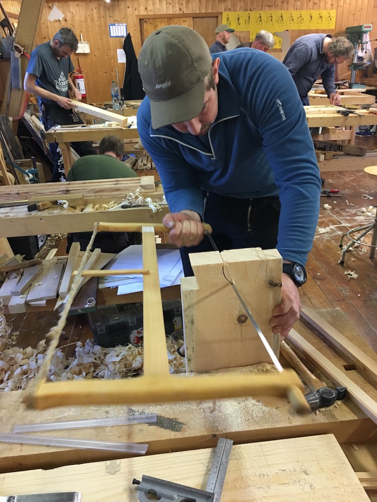 Sven prøver ut rundsaga til å fjerne material frå karmsink.