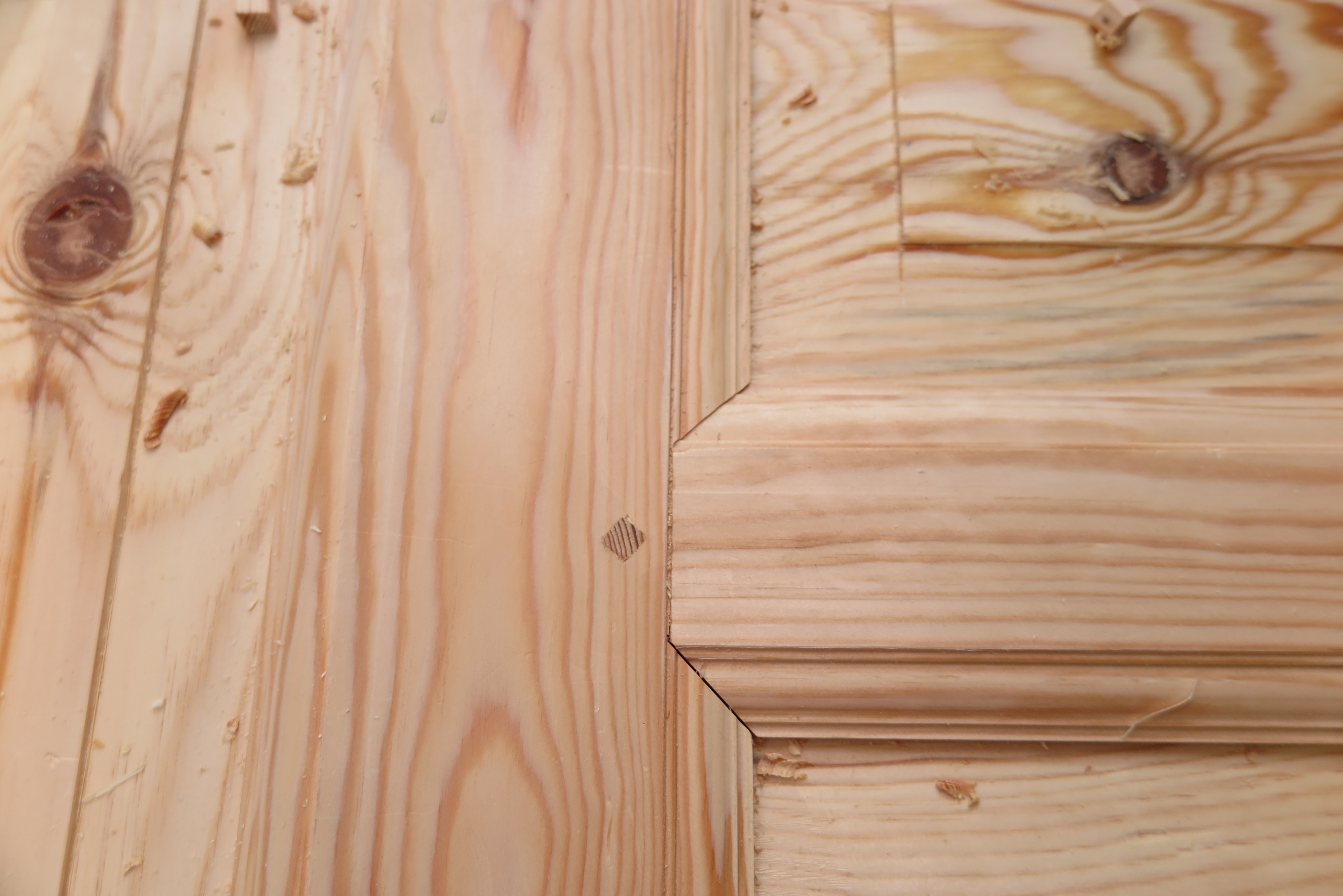 Ferdig samansett gjerda og profilerte ramtre med fyllingar.