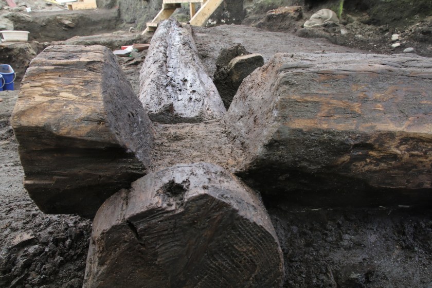Previous Image Next Image 45184 og 45200 lafteknute profilsnitt_IMG7711 Svillstokkene i bygning 4 under Klemenskirken. Her er det mye informasjon å hente. Er det forresten et måsåfar på oversiden av stokken? Foto: NIKU