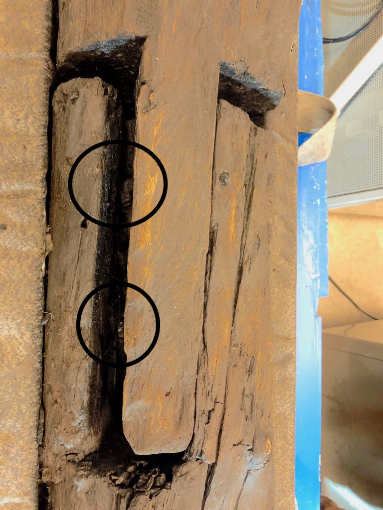 Previous Image Next Image IMG_2659 Blad skjøten sett ovenfra , den var plugget med to treplugger. Lyset på bildet er litt manipulert for å få frem pluggene.