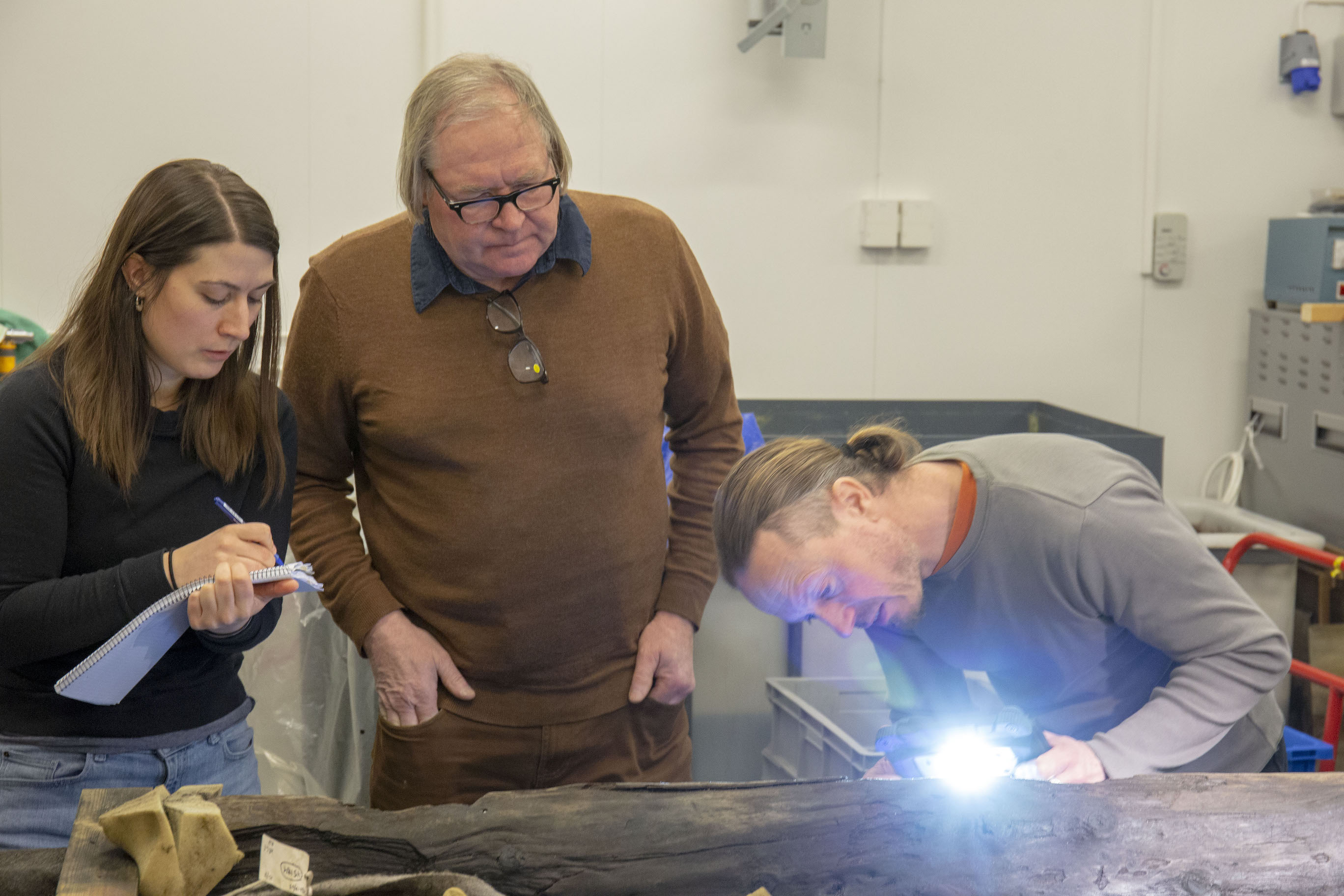 Previous Image Next Image IMG_5907 Ingeborg Sæhle noter mens Per steinar forteller hva han kan lese på tømmeret. Foto Kristoffer Brink, NIKU