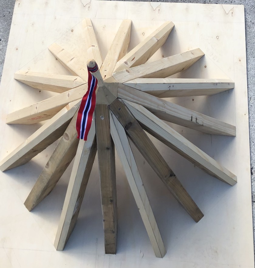 Previous Image Next Image ferdig takverk Takverket er ferdig og flagget heist til topps. Den tradisjonelle sperreskålen pågår i bakgrunnen, men egner seg ikke til å vere med på foto.