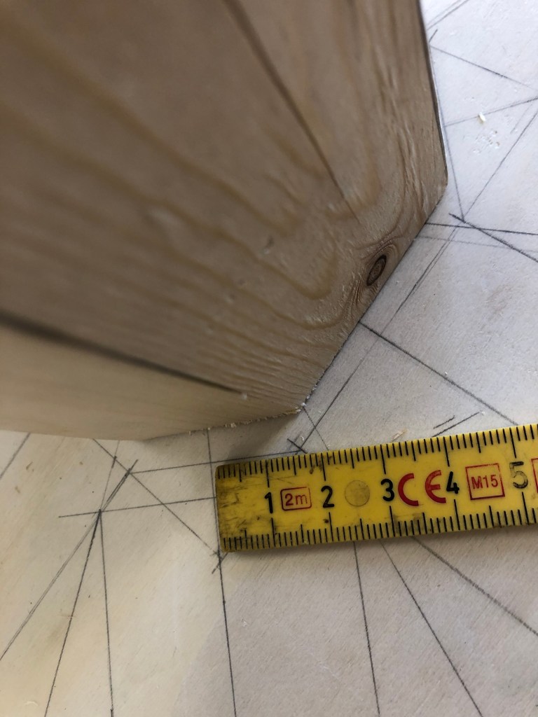 Previous Image Next Image IMG_1416 Avfasingen på stikksperren måles på grunnrisset fra senterlinjen mot omrisset til anleggssperrer og avsettes på emnet sammen med vinkelen til anleggsflaten mot søylen