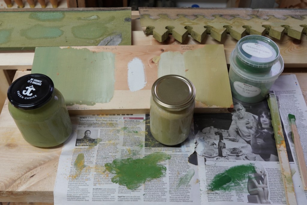 Grunnlag for maling er en blanding av 2/3 del hvit linoljemaling samt 1/3 del kokt linolje . Jeg har brukt verrona grøn jord, gulloker og kromoksid grønt som pigment for å oppnår riktig fargteton.