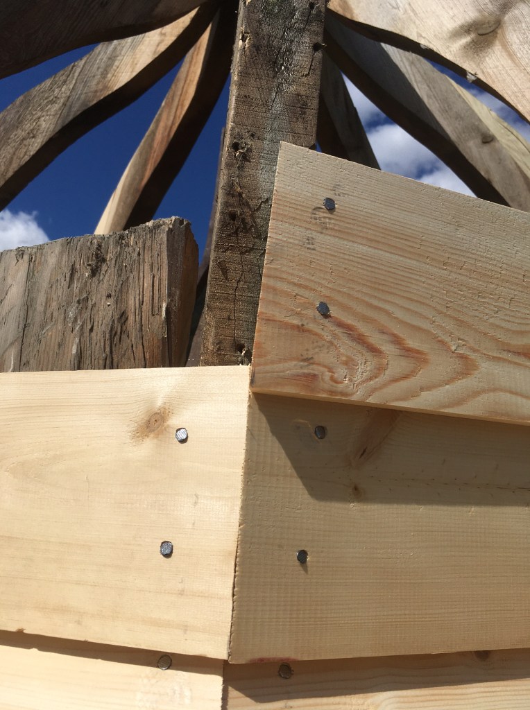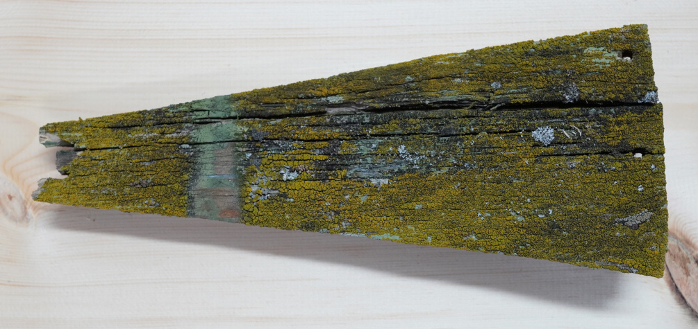 På bildet over til høyre vises det anordning av kledningsbord og mindre råteangrep i sperrer. Målet er å demontere alle bordene, skifte ut all kledning og utbedre deler av konstruksjon som har råte og erstatte med nye bord i senvokst furu med handhøvla overflate. Linoljemaling skal blandes selv ved å bruke pigmenter til å komme så nær original farge som mulig. Bildet viser to forskjellige grønntoner. Hele tårntekkinga skal males med to strøk etter ferdig montering.