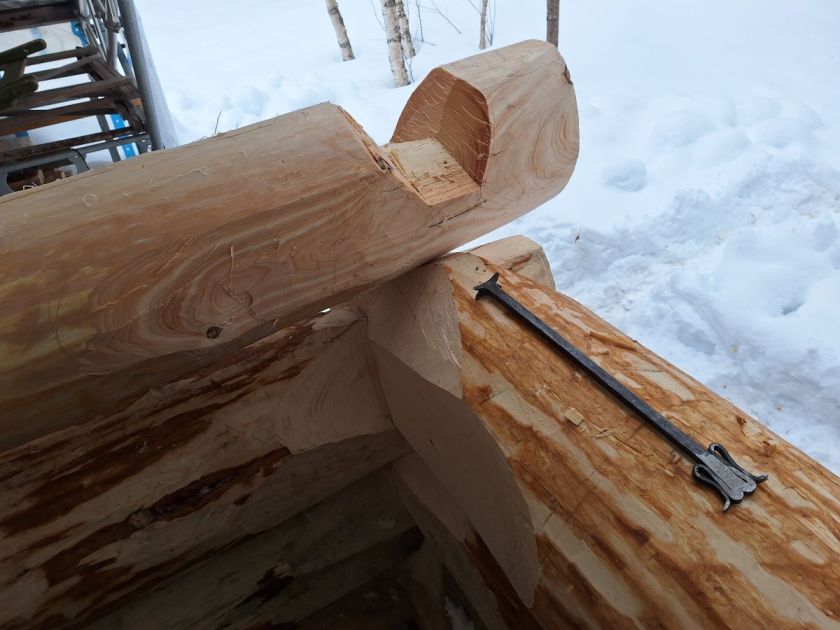 Meddraget ble ført systematisk rundt hele stokken, og utenfor veggen ble det lagt til om lag en halv centimeter på høyden, for å få luft mellom novhodene. Kinningene var ganske bratte, så etter noe prøving og feiling kom jeg frem til at en maur på 4 millimeter passet best. Deretter ble stokken tatt av og lagt opp ned, og holdt trygt og sikkert i posisjon av det store v-forma overhogget i stokken under, ble medfaret og siste finish i underhogget gjort med den smale huggøksa. Deretter ble kinnungen lagt på plass.