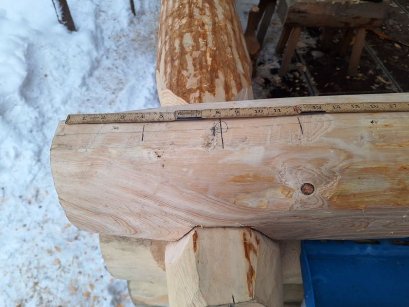 Kinnungen ble lagt på plass i overhogget til møtende stokk på langvegg, og sidelengs plassering ble bestemt av å lodde senter ned langs novhodene under. Stokken ble satt opp med lik stikkhøyde/fallhøyde mot omfaret under, og som et utgangspunkt for å merke opp underhogget, trakk jeg to loddstreker opp på siden av kinnungen fra kantene av den 2″ brede flata på toppen. Med passeren ble stikkhøyden nå brukt til å merke punktene hvor kinningsflatene skulle ende mot loddstrekene, og kinningsvinkelen ble overført ved parallellforskyvning med en tommestokk med passende antall blad slått inn for å få rett mål. Ifølge Håvar var ikke barken ment å fylle overhogget nøyaktig; på referansebyggene han hadde undersøkt i tilknytning til sin egen bacheloroppgave var det godt rom imellom, og derfor ble barken merket med stikkhøyden minus den faste meddragshøyden (19 mm), samt en ekstra centimeter. Deretter ble stokken snudd og nakkeskåra hugget ut, med barke og det hele. Så ble stokken lagt på, klar for meddrag og maur (Fig.2)