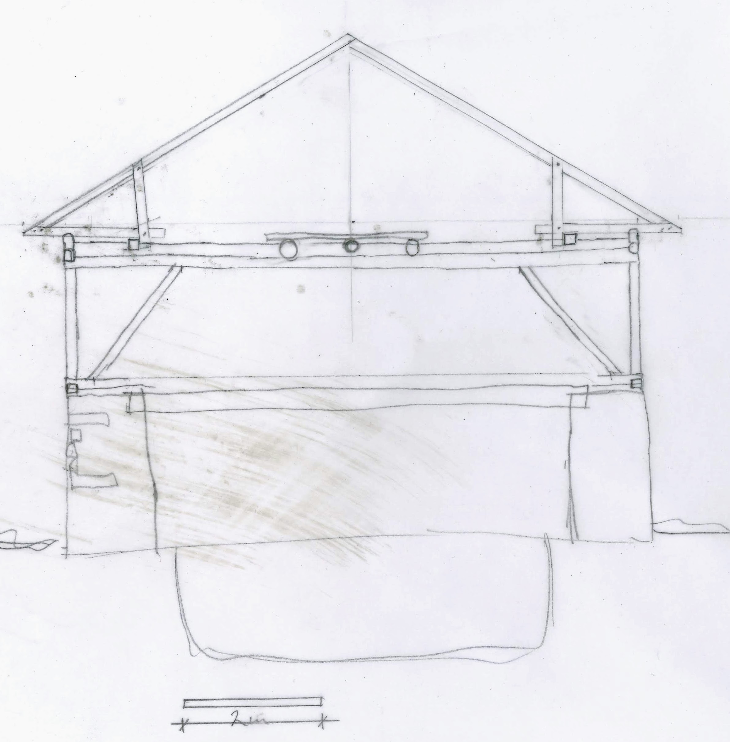 Slik jeg tolker den kaller jeg det en «sperrebukk-konstruksjon med åser» systemet her gjentar seg med 4,4meters avstand ca 7alen. Trekonstruksjonen består av en svill (8×8)som kommer dårlig frem på tegningen, denne er det felt en ca 90cm lang pute (8×8) over. Stolpen (8×8)og skråstreveren (6×6) danner en trekant ifra kontaktpunktet ved svilla og den nederste beten.Som klemmer sammen «sammhaldet» mot en ny trekant ved takfoten. trekantene i sperreverket danner direkte lastveier og reduserer nedbøyning av sperra.