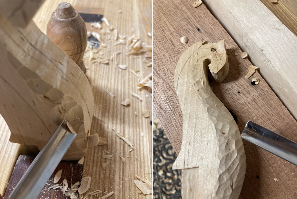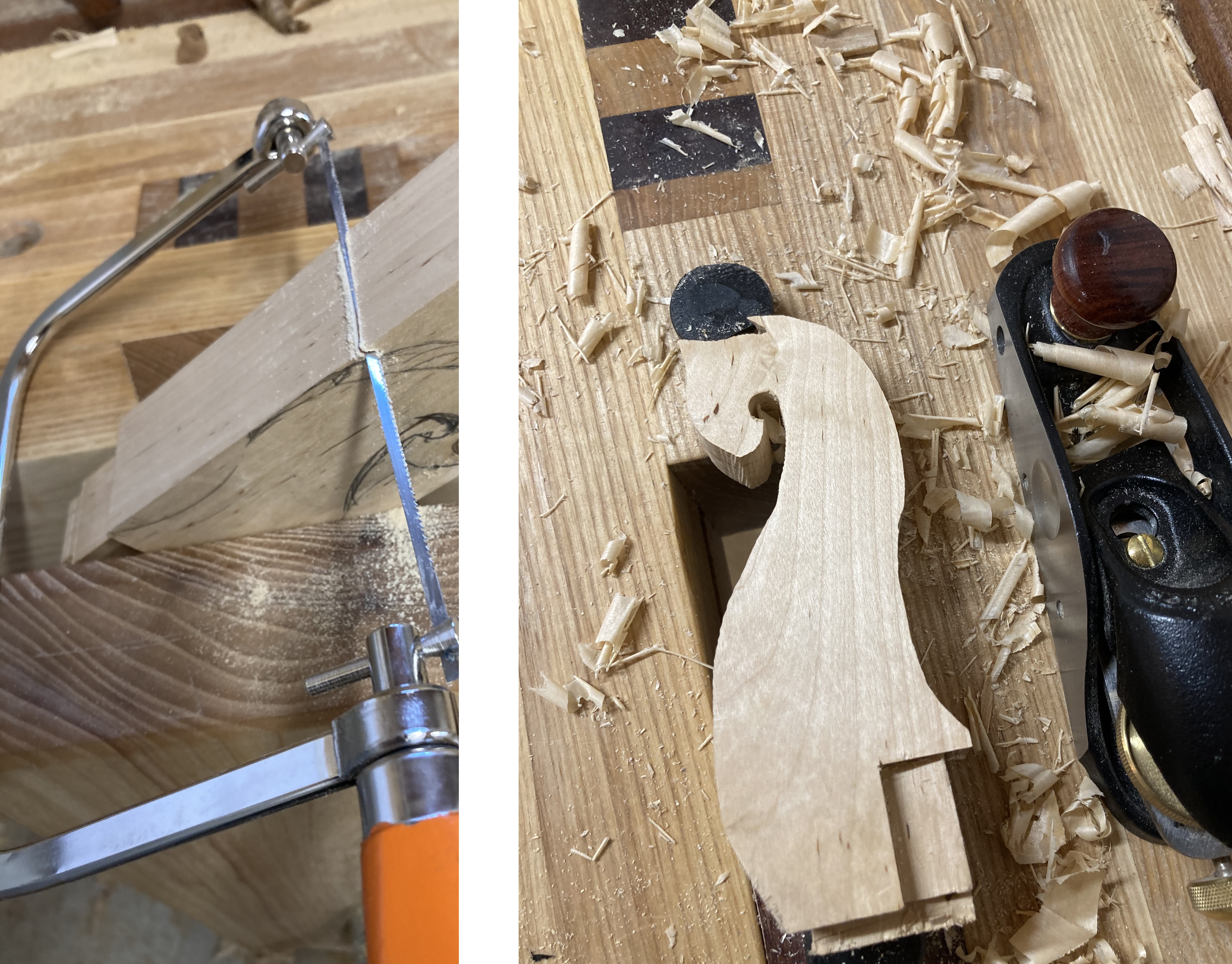 En løvsag brukes til å sage ut konturene av kranen og koningen. Etter saging slett høvles den koniske formen med støthøvel før sponhøvelen brukes til å slette konturen.