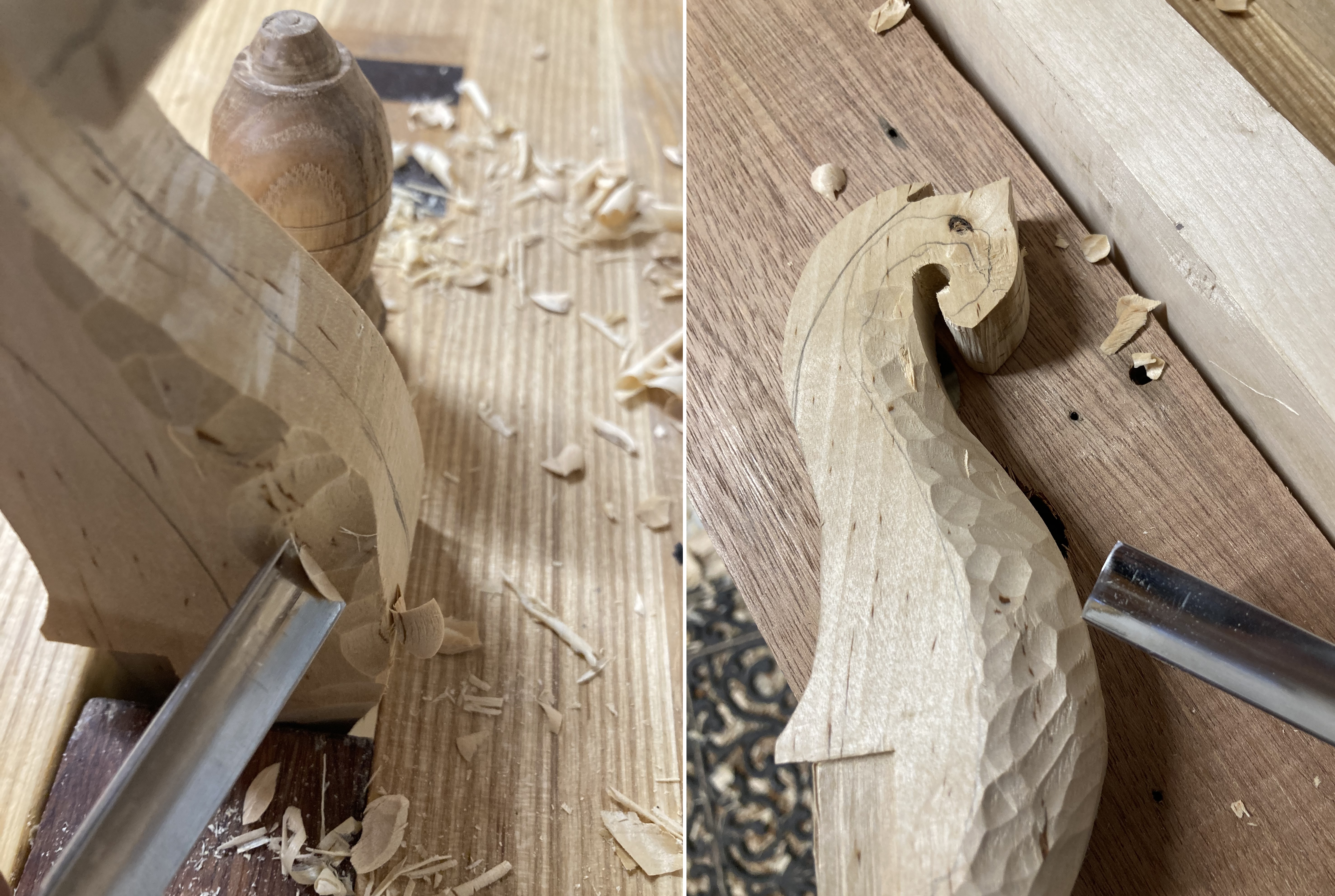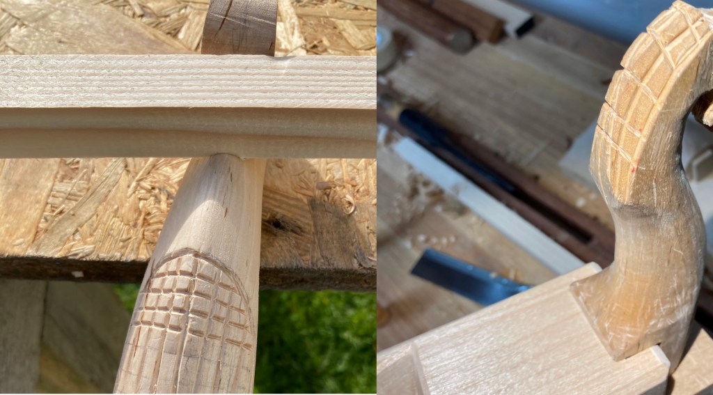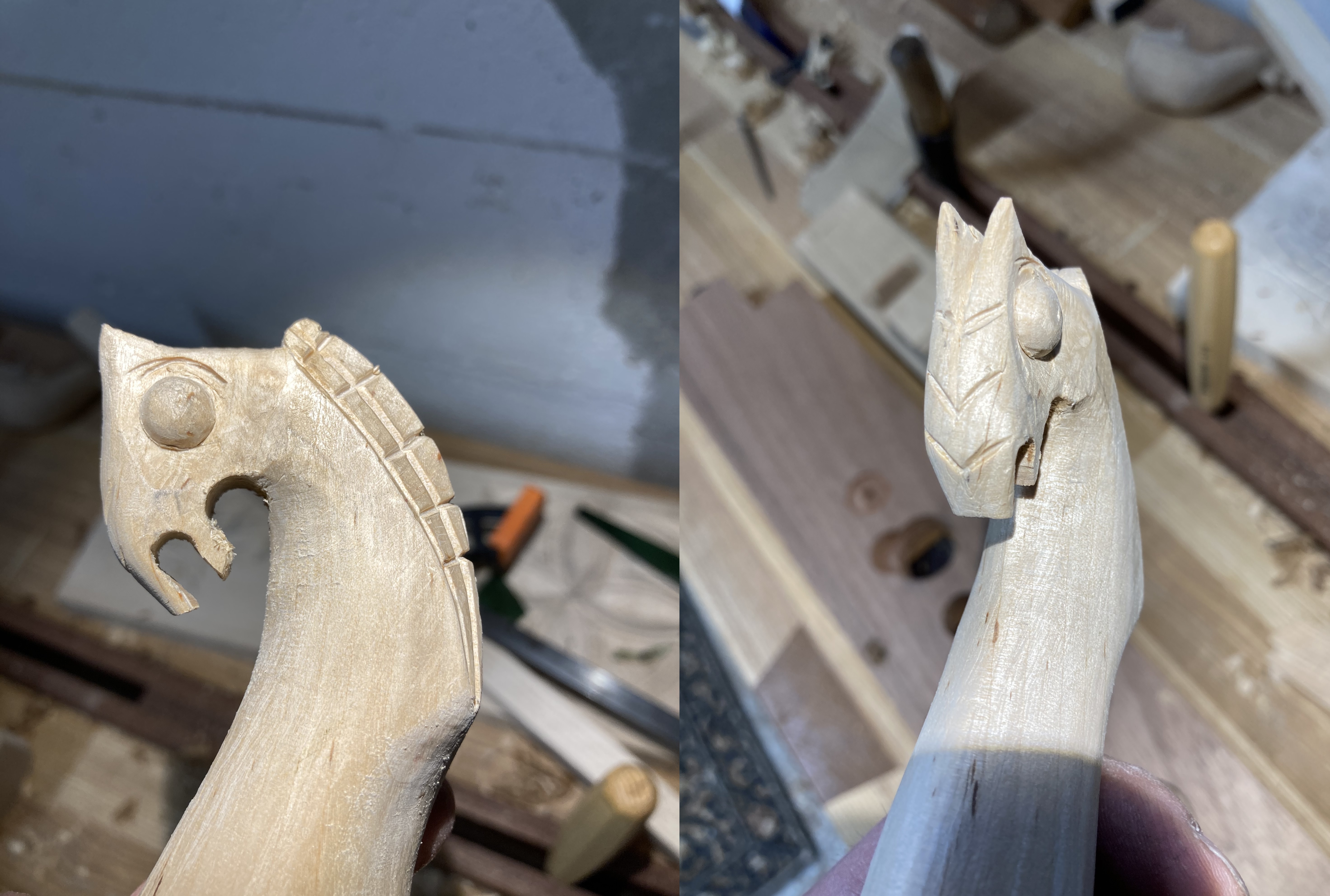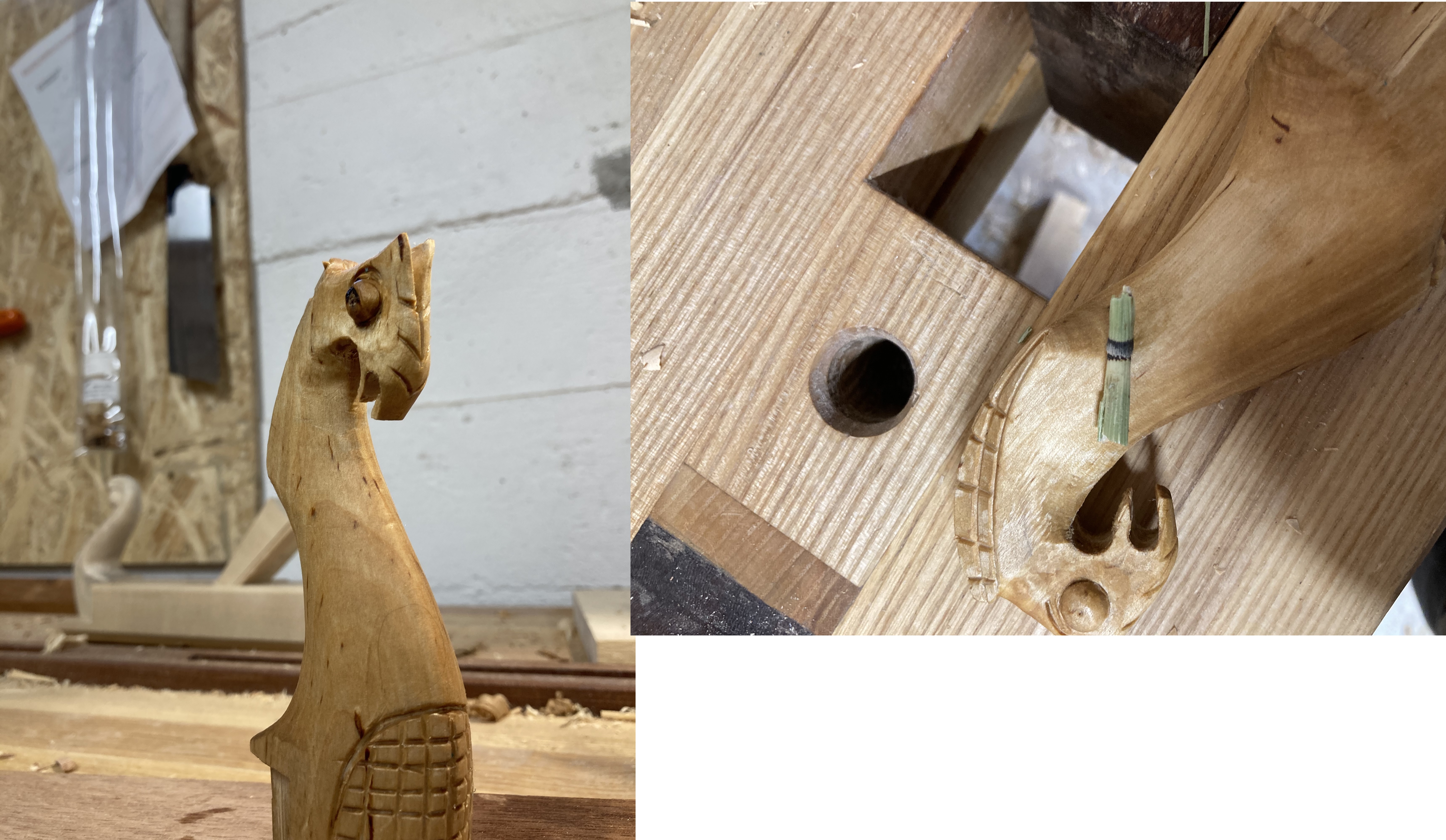 Undertegnede er langt ifra noe ekspert i treskjæring, før samlings uken på læringsarena hadde jeg aldri prøvd noe innenfor treskjæring, så det sier seg selv at mine kunnskaper og evner innenfor dette er svært begrenset. Jeg har likevel helhjertet prøvd å påføre kranen noe enkel dekor i form av noe rutenett og formet 2 små kuler som utgjør den mystiske skapningens øyne.