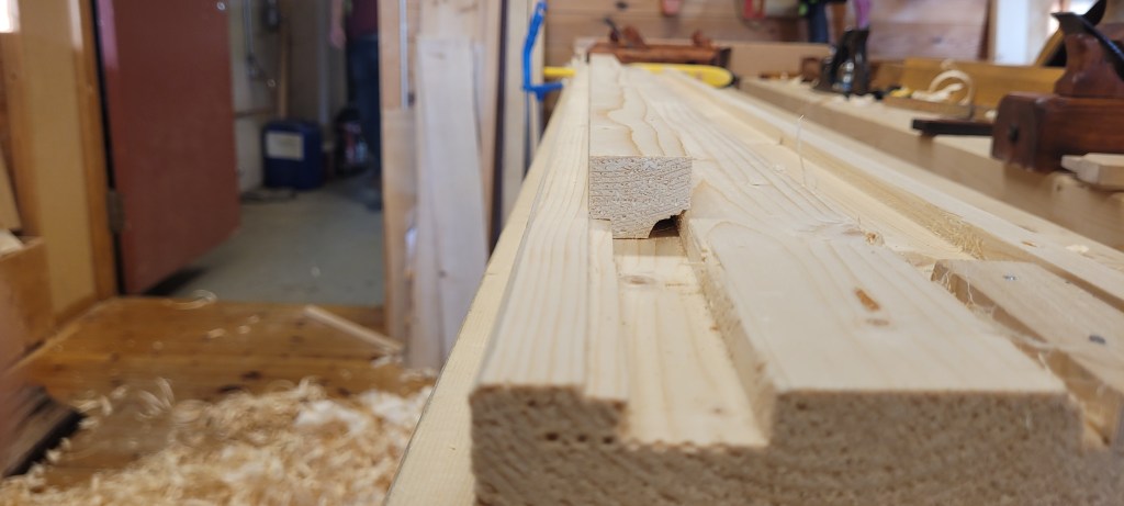 Emner til karm og midt post blir dimensjonert. Høvlet profil og fals på midtpost og karm før de blir sinket sammen. En annen student skriver om dette så jeg går ikke inn i detaljer på høvling og sinking av karm.