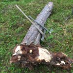 Vi brukte stropper for å holde rotknea til staven når vi arbeidde med merking og tilpasning. Vi meddrog og tilpassa rotkneet til stav/sammhald. Rotkneet ble festa både i stav og samhald. Til dette brukte vi 1″ trenagler av furu. Det ble brukt 1″ navar til å bore hull for naglene. Naglene ble så kløyvd ut av rettvokst alved av rotstokken på furu. Emna ble spikka til koniske med firkanta tverrsnitt med brekte kanter.