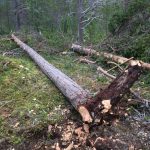 Når treet er veltet kan vi bestemme oss for hva som er det beste emnet. Dersom man er heldig, kan man få to rotkne av et tre som er felt. Men det er sjeldent, fordi da må emnene stå 180 grader ovenfor hverandre. Vi skulle ha totalt 6 rotkne. Vi måtte da felle 6 trær. Emnene ble hugget til på overmål for frakt til kjørevei for videre transport til verkstedet. På verkstedet ble emnene justert på dimensjon for å passe inn i bygget.