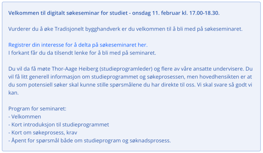 Vi vil også gjøre oppmerksom på at neste opptak til tradisjonelt bygghandverk er høsten 2022, med søknadsfrist våren 2022.