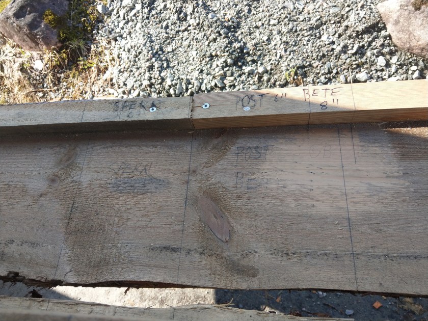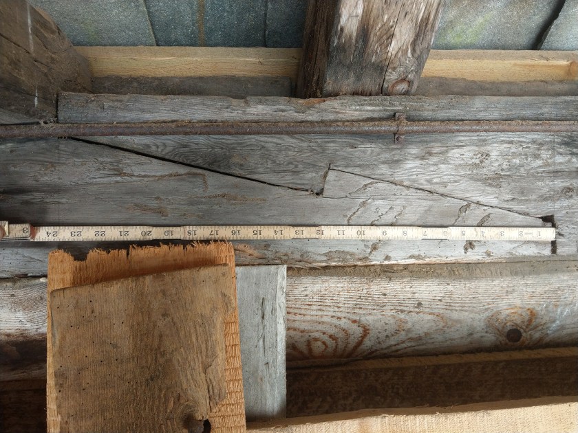 Selve merkingen var hovedsakelig gjort med blyant, selv om vi fant spor etter rissnål på enkelte steder. Tapphullene var merket med 2 1/2 » fra utsiden og 1 1/2″ i bredden. Denne metoden er ganske så genial, fordi man da ikke må ta hensyn til tykkelsesforskjeller mellom stav og stavleie/bunnsvill. I tillegg er man sikret at utsiden, som skal få kledning etterpå, har en jevn overflate. Siden strekene er så presis på tommemålet er det sannsynlig at man har brukt et mål til å streke etter. Avstanden mellom sperrene er rundt 3 norske alen. Men her er det litt variasjon. Det er altså ikke sannsynlig at man brukte en lekt til å måle nøyaktig avstand. Muligens brukte man bare en alenstokk til å finne sirka tre alen mellomrom.