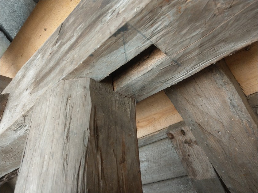 Som en kan se er det gamle taket godt dekket med furunåler. Noe som sikkert også har fremskyndet råteprossesen fordi opptørkingen, som er særs viktig, ikke har kunnet skje rask nok.