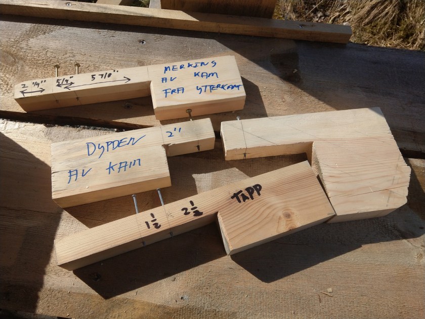 Etterpå legger man emnene i tur og orden på benken og overfører målene med en vinkel. Til å markere tapphull og plassering av kammer og lignende, lagde vi oss flere forskjellige ku.