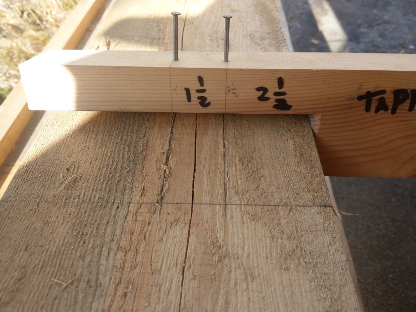 Nå viste etterhvert trenaglene seg å komme til nytte. Etter å ha hogd falsen var det nå enkelt å sette borda sammen igjen for å se om vi hadde truffet godt med falsen. Uten naglene ville vi ikke hatt et fast referansemål å se etter for å kunne bedømme om falsen må justeres. Men naglene gjør at borda kommer til samme posisjon hver gang, og gjør det enkelt å justere falsene. Dette er nok den viktigste oppgaven naglene har, og de holdt også døra godt sammen når vi skulle merke opp for neste operasjon: