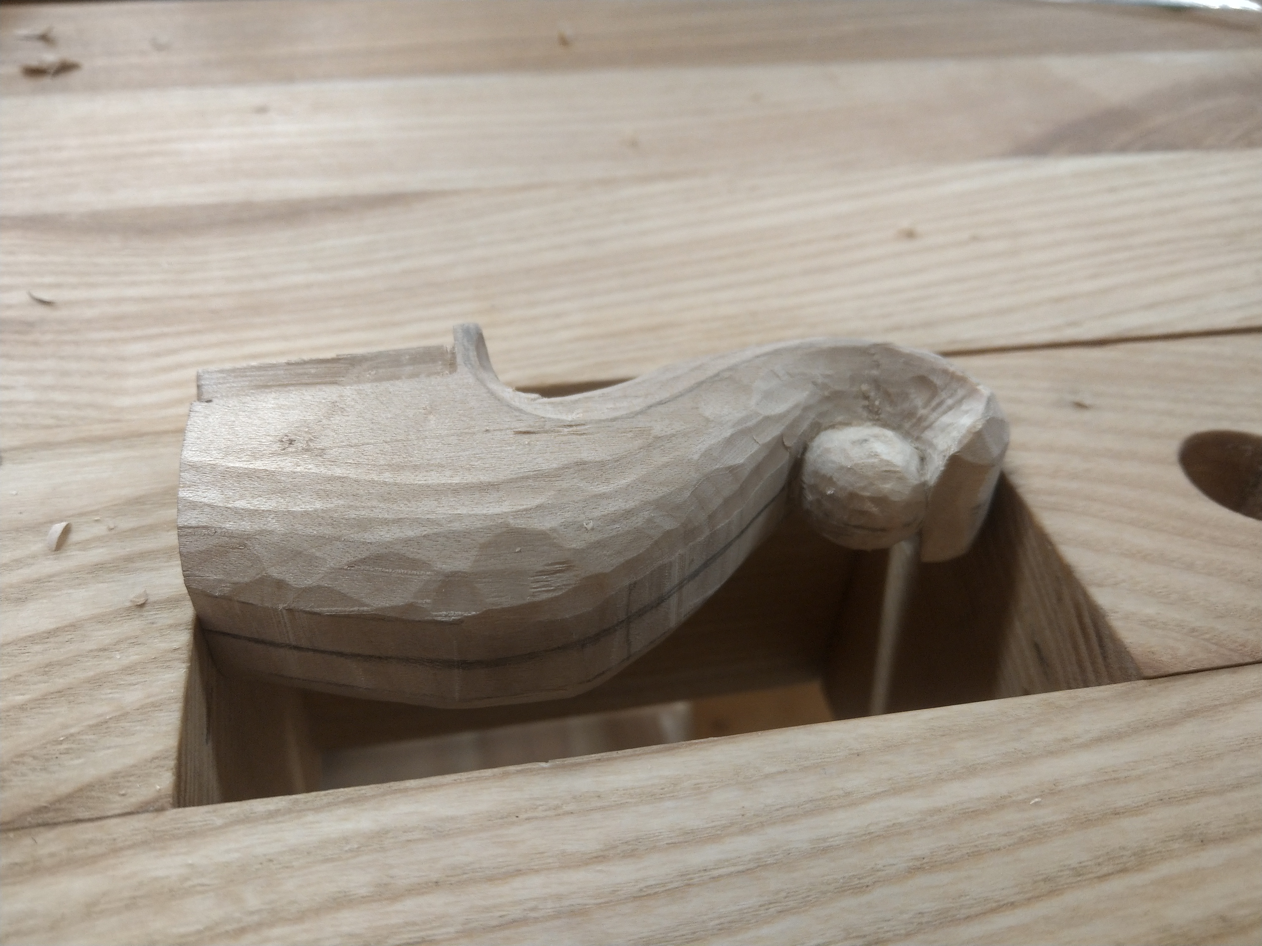 Etter at hull var boret og nagler tilpasset hogg vi ut falsen. Bilderekka nedenfor viser noe av gangen i dette arbeidet.