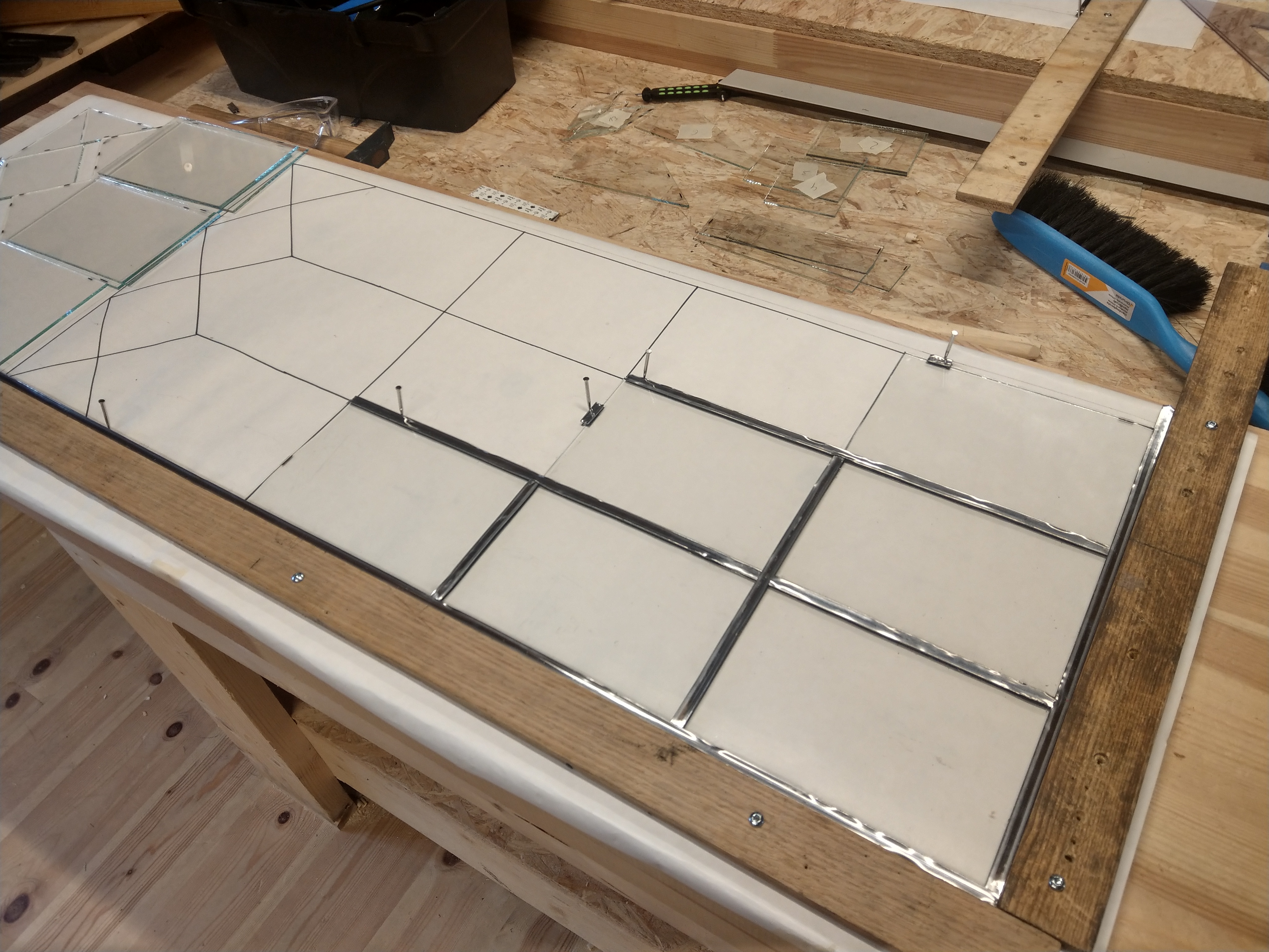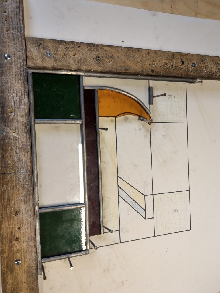 Den tredje uken reiste vi til Trondhjem for å få et innblikk i glassmesterens verden. Veilederen her var Elisabeth Voss Sinnerud, fra Nidarosdomens restaureringshåndverkerne. Etter en kort innføring i glassets historie fikk vi en omvisning i Nidarosdomen, og svar på mange av de spørsmålene vi hadde. Tilbake i stilleverksted begynte vi å tegne opp et vindu som vi selv skulle lage. HMS var også her i fokus, håndtering av glass og bly, glasskjæring osv. Snekkerens høvelbenk viste seg også her å være alt for lav, noe korsryggen min ga klar beskjed om. Vinduet jeg lagde var så stort at Elisabeth anbefalte meg å lage to stormbånd til å stabilisere og sikre vinduet med. Noe som medførte til at jeg, fortsatt etter smiuka, er veldig komfortable med å lage stormbånd selv. Etter at man har satt sammen vinduet, måtte man til med lodding og kitting.