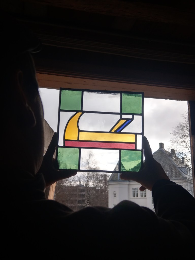 Når vi var ferdige med vinduet, laget hver av oss et selvvalgt bilde med farget glass. Den siste dagen viste Elisabeth oss hvordan man kan skifte ut en glassrute hvis det skulle være behov for det, og hvordan vi ser at blyet må fornyes på gamle vinduer.