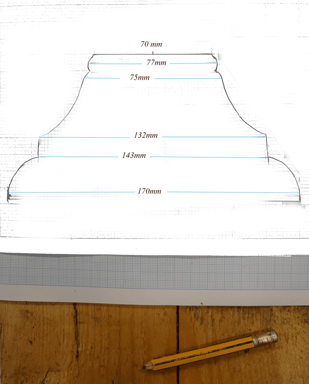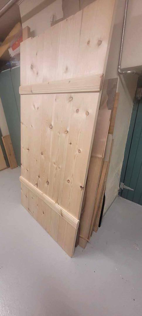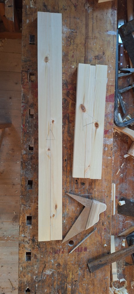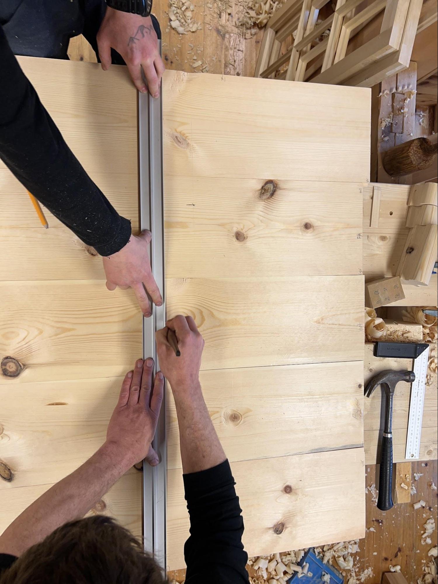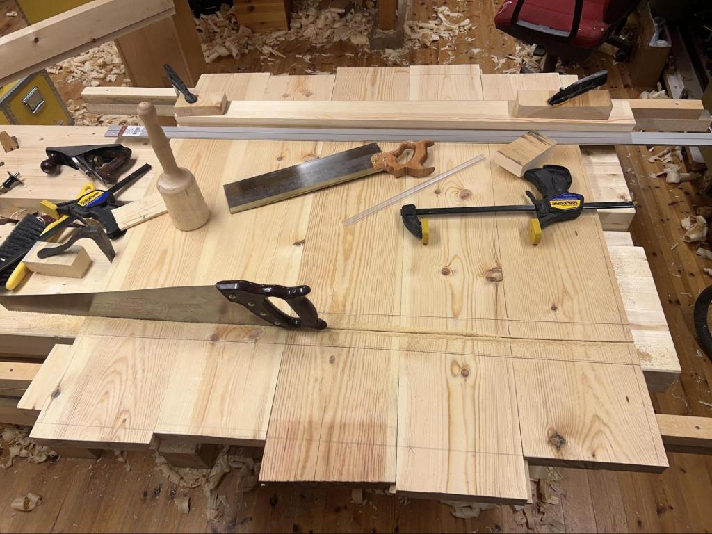 Vi lagde oss en lekt som vi hadde satt av alle målene vi trengte på. For side-ramtreene brukte jeg lysmål som referansemål, mens for tver-ramtre og sprossa brukte jeg falsmålet som referanse.