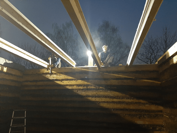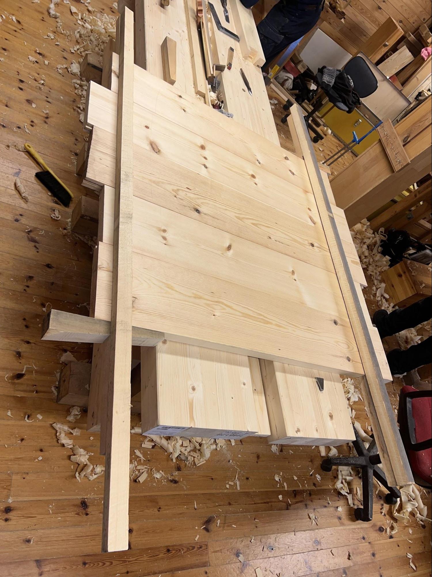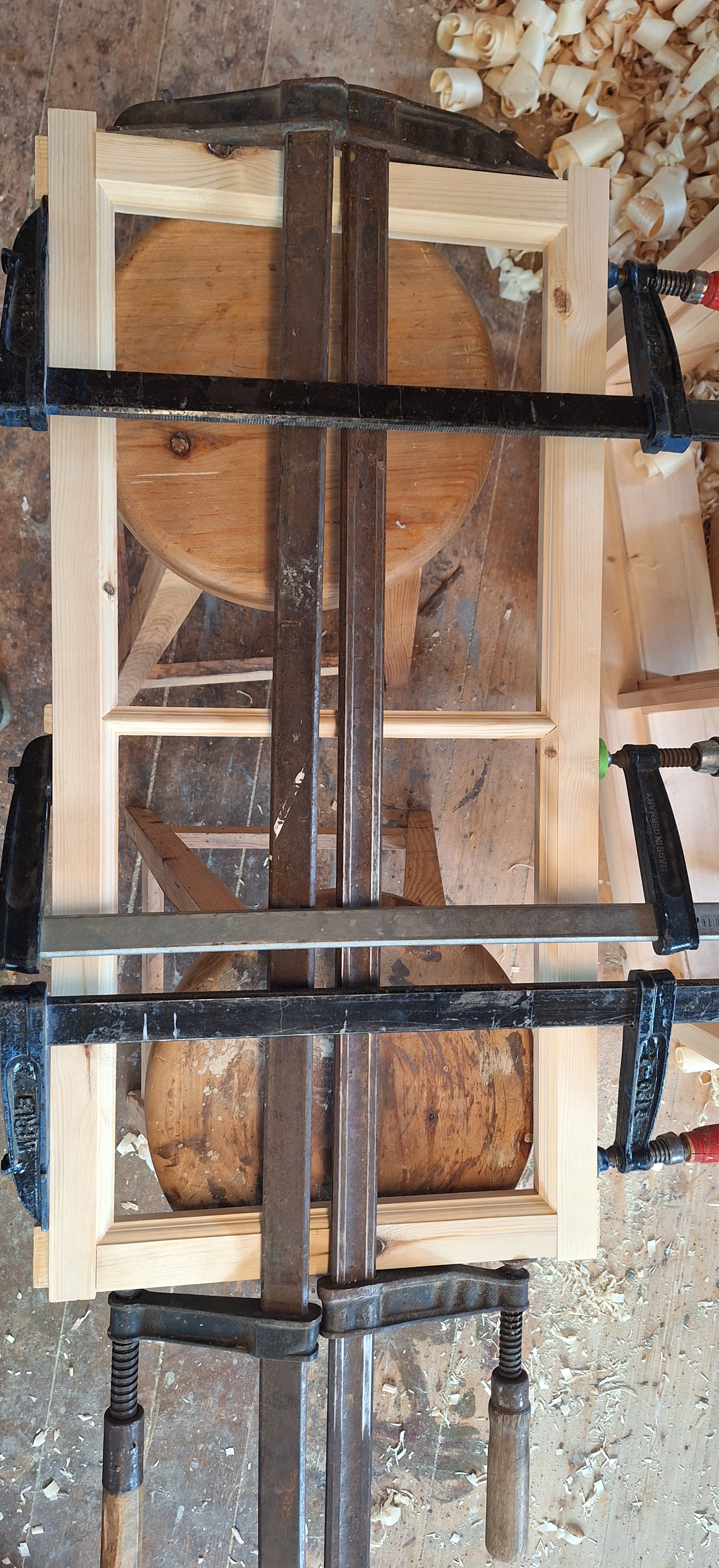 Når alle delene var ferdige, så var det bare å montere de sammen. Vi satte på skrutvinger for å presse sammen i hjørnene og mot sprossene. Det hendte seg at det måtte justeres noe i sammenføyningene, men etter å ha produsert et par rammer, så merker man fort hvilke punkter som er kritiske. Vi fant også ut at mye går sammen med kompresjon når man setter på tvingene.