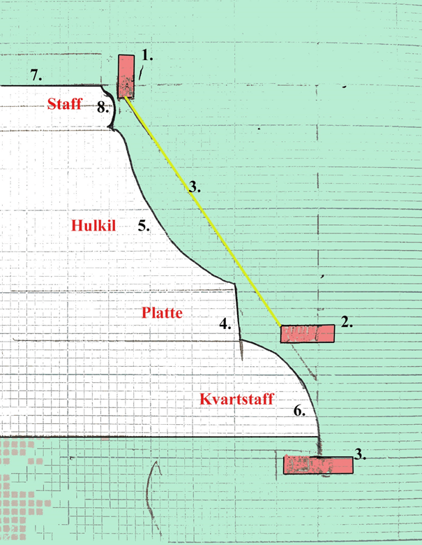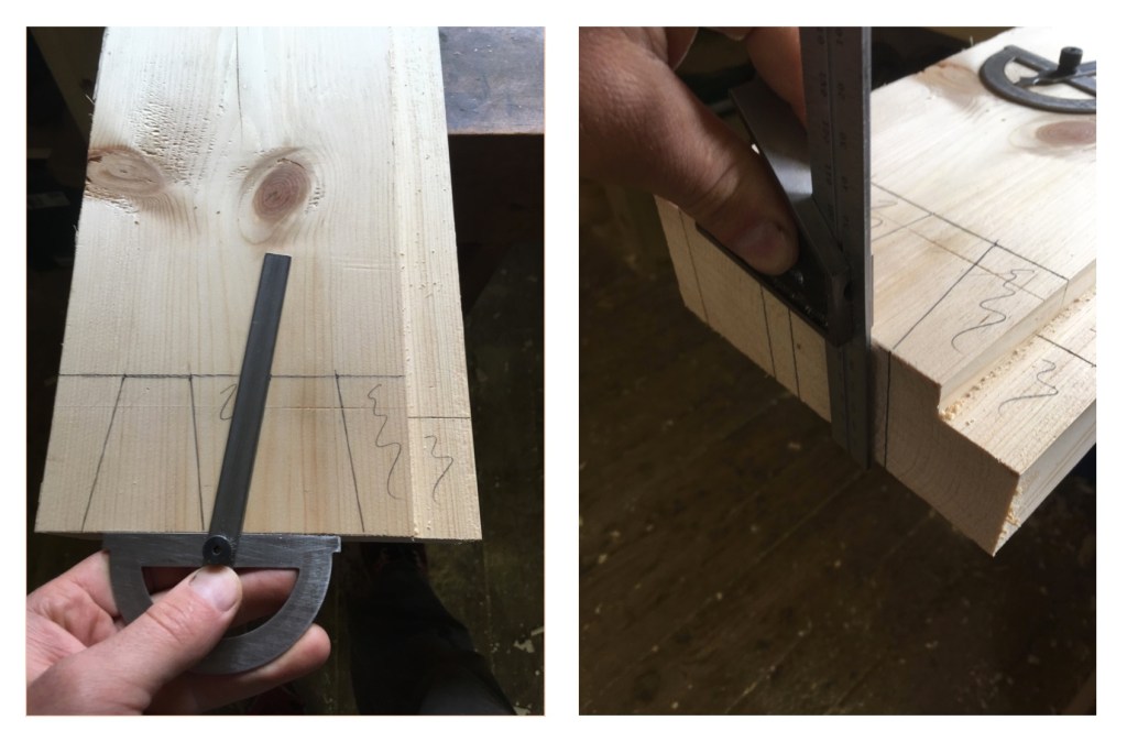 På vinkelen min hadde jeg et merke som indikerte differansen mellom falsmål og lysmål. Denne brukte jeg for å overføre lysmålet på den ene siden av tverramtreene når jeg risset/vinklet målene rundt emnene.