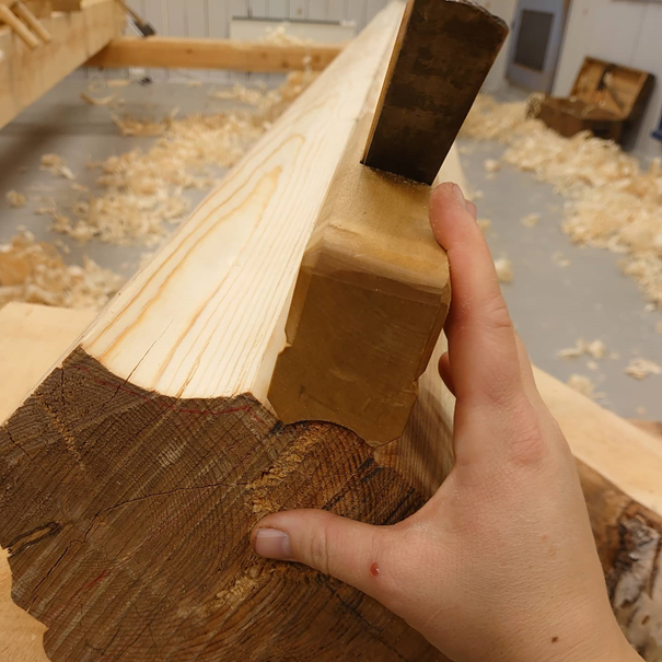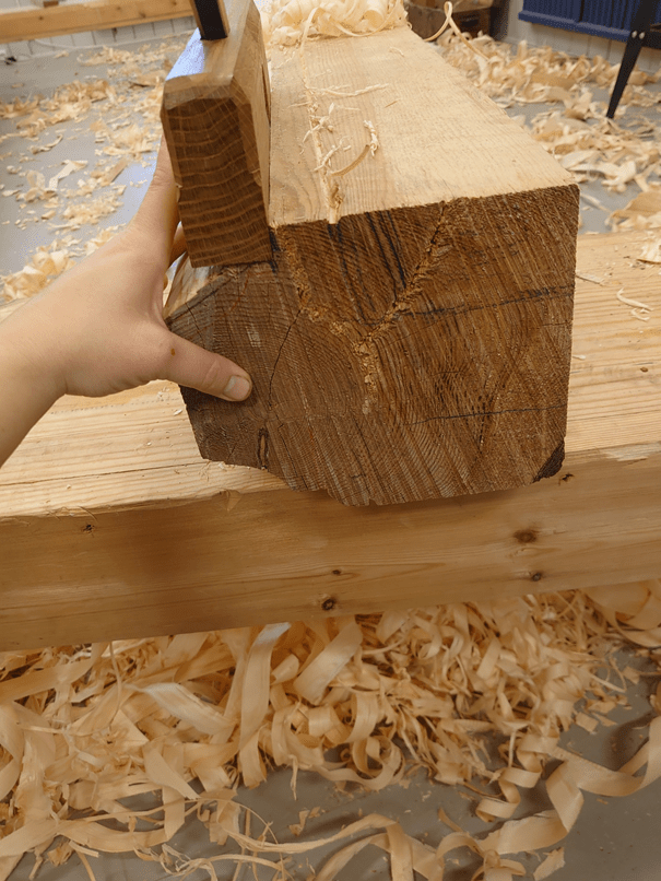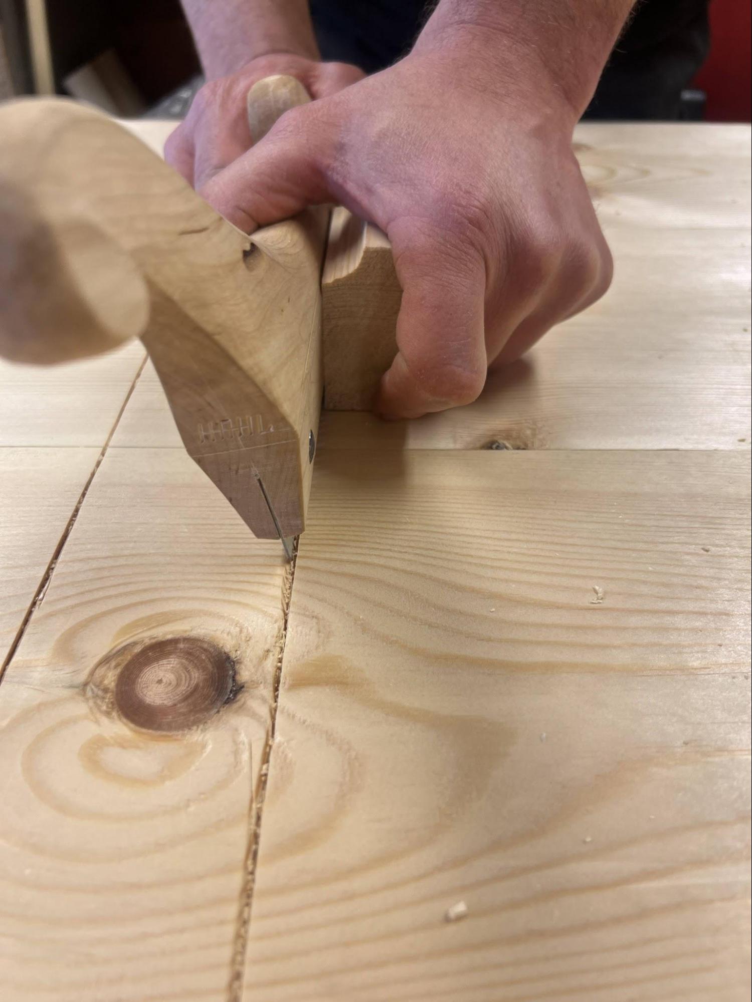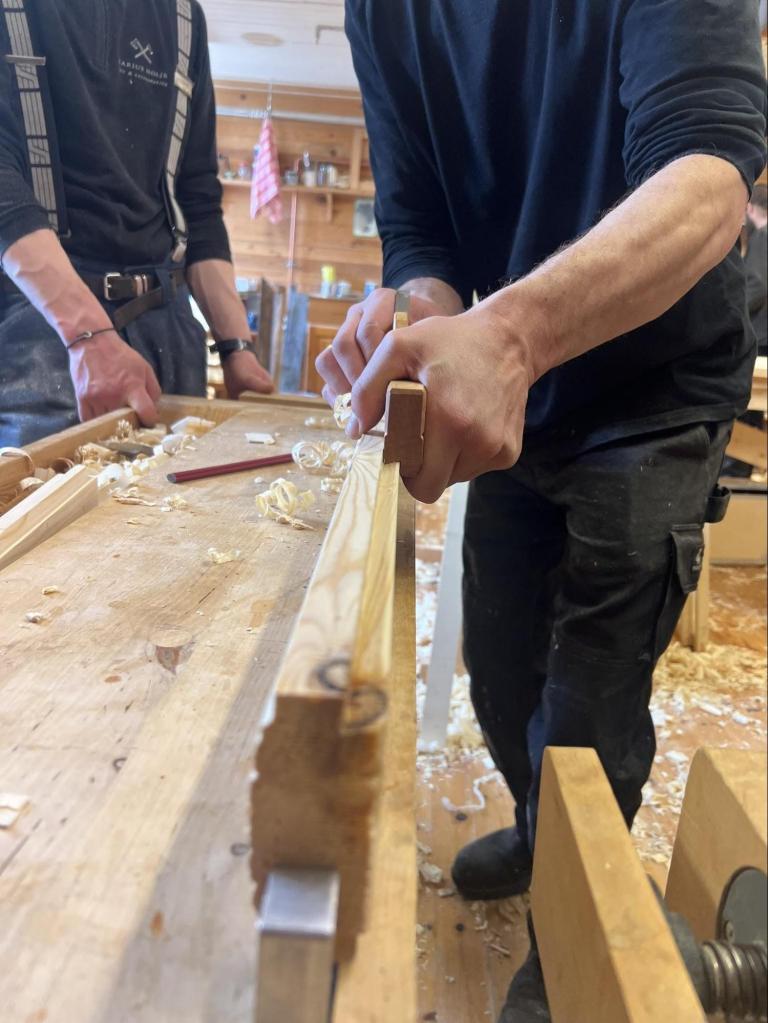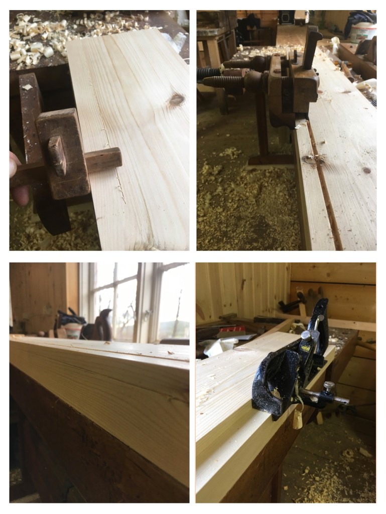 For å komme videre, så var det på tide å høvle på fals og profil på emnene. Dette gjorde vi med en kombihøvel som ofte kalles «glashøvel» og som vi produserte i første uka av praksisperioden vår. Du kan lese mer om glashøvelen og hvordan vi lagde denne i Olav Erik Kvaal sitt blogginnlegg.