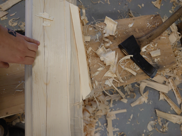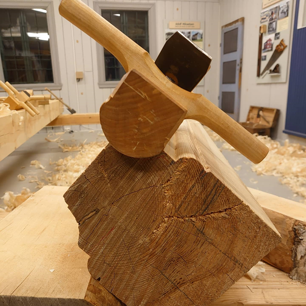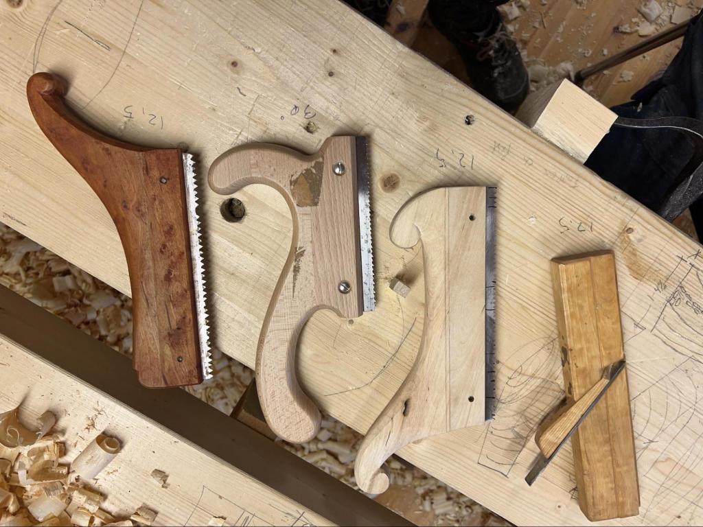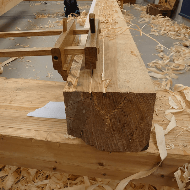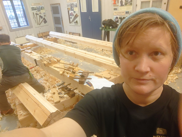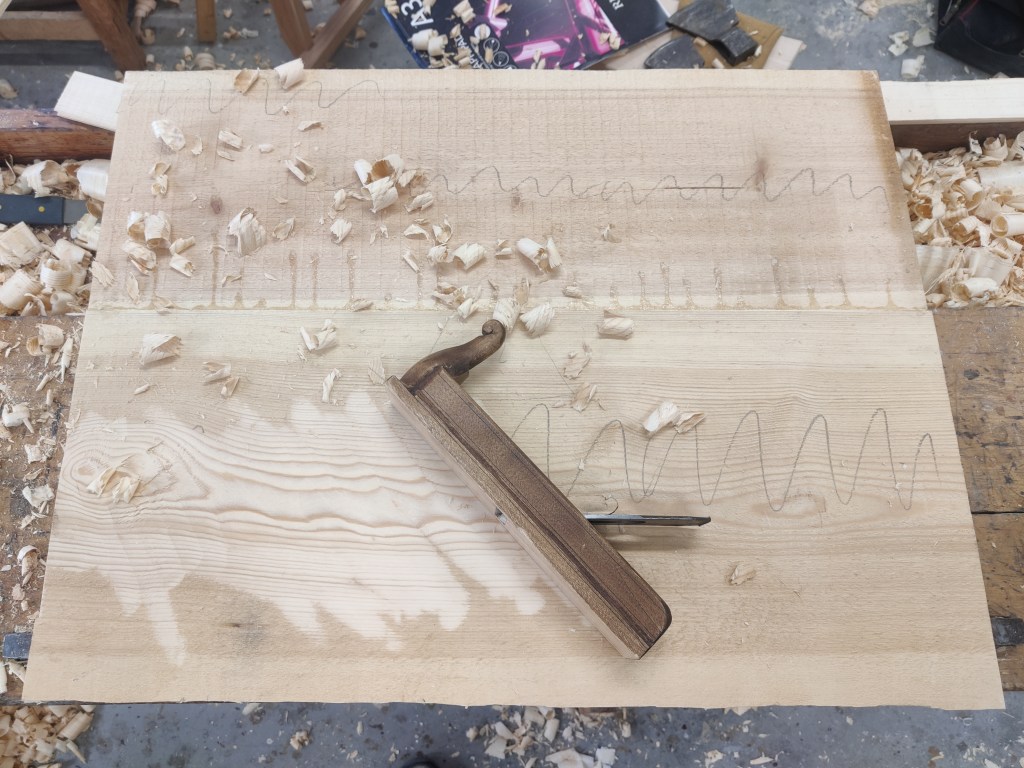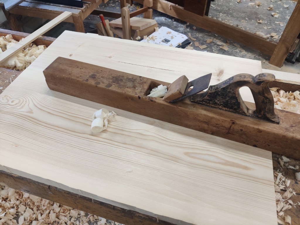 For å komme videre, så var det på tide å høvle på fals og profil på emnene. Dette gjorde vi med en kombihøvel som ofte kalles «glashøvel» og som vi produserte i første uka av praksisperioden vår. Du kan lese mer om glashøvelen og hvordan vi lagde denne i Olav Erik Kvaal sitt blogginnlegg.