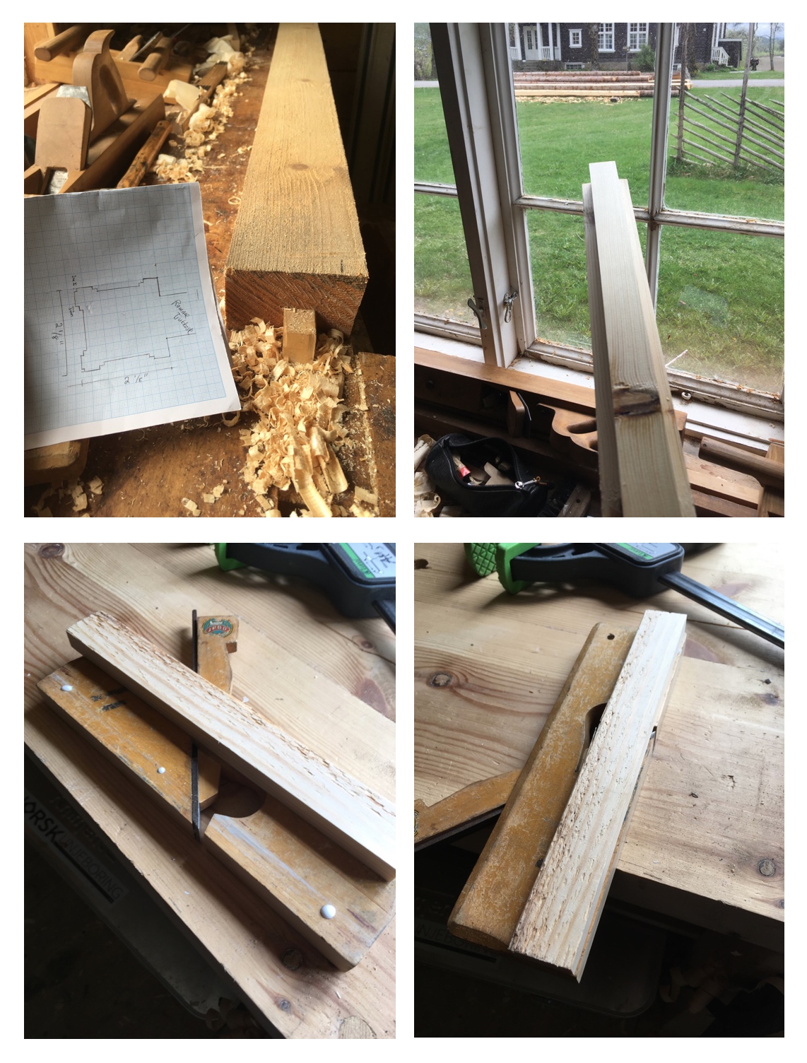 Steg 1. Dimensjonering: Emnene måtte høvles og dimensjoneres. Dette ble gjort kun med tradisjonelle verktøy (grindsag og høvler). Til en vindusramme trengte vi 2. stk side-ramtre, en sprosse og 2stk tverr-ramtre. Dimensjonen på ramtreet satte vi til 32,5(5/4’’) x 45mm og sprossa ble 30 x 20mm. Dimensjonene hentet vi fra en vindusramme produsert på 1800-tallet. Det var også fra denne gamle ramma at vi hentet ut målene og profilen til glasshøvelen.