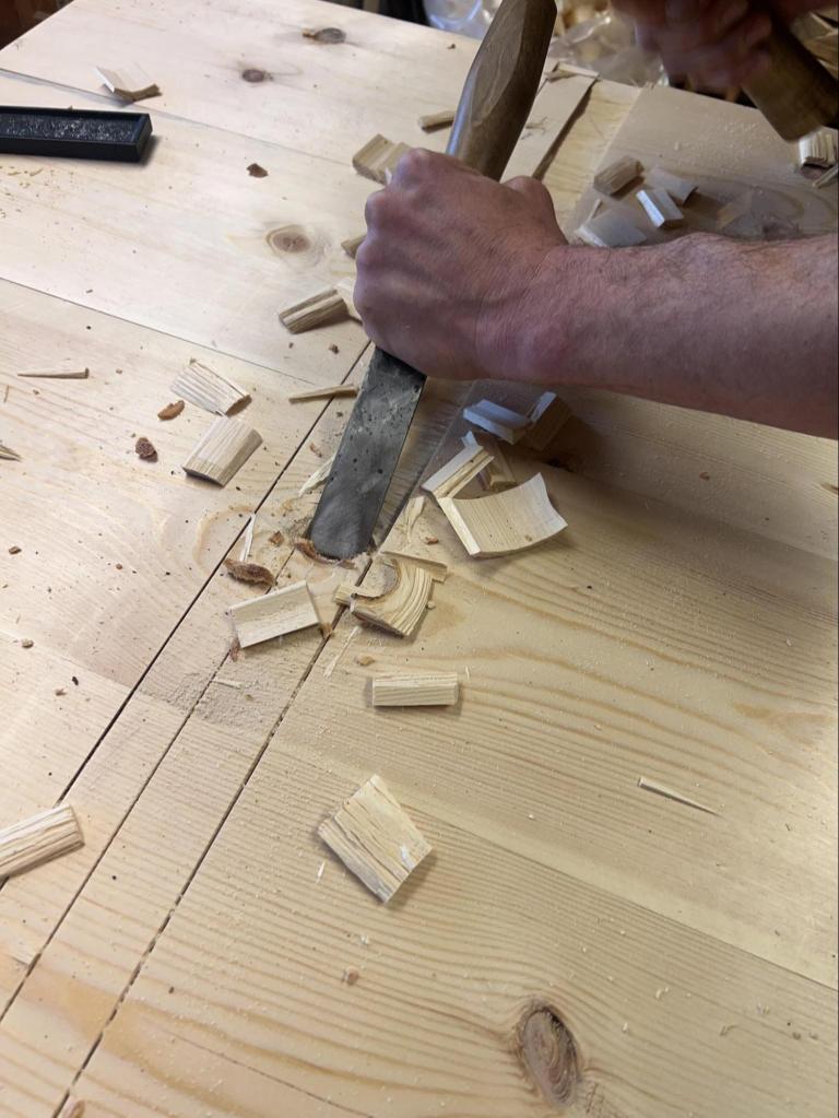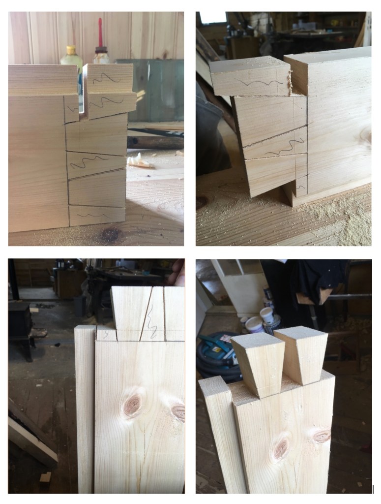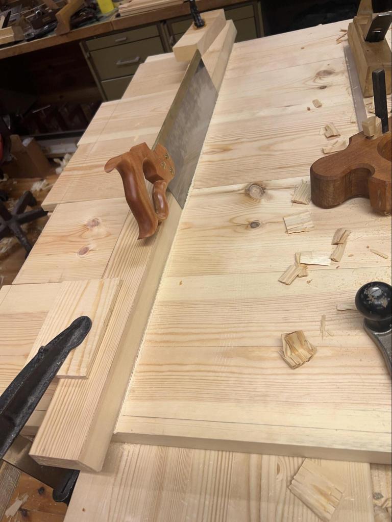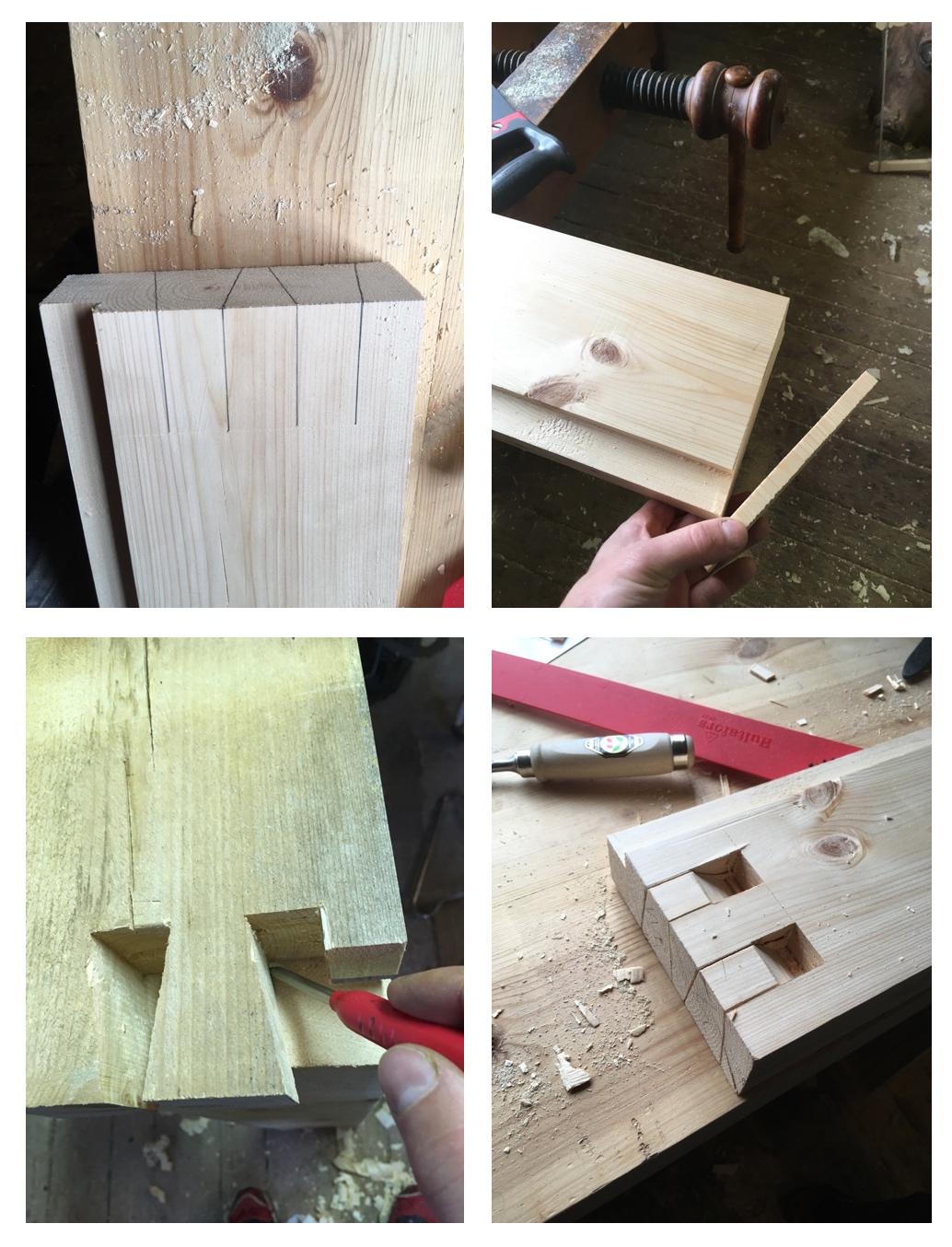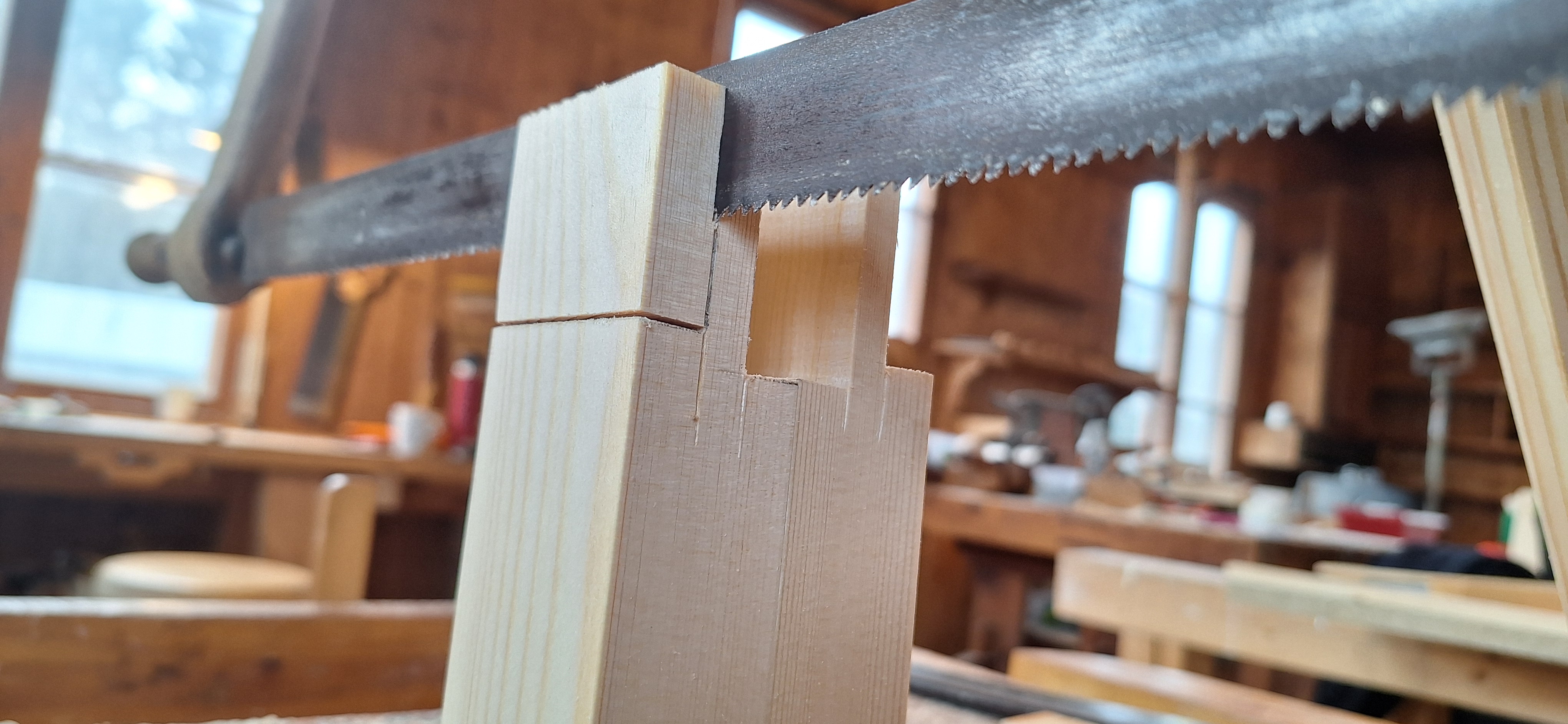 På tver-ramtreene sagde jeg først ned «nakkingen» med en bakksag. Deretter var det å sage ut tappene og slissene. Dette gjorde jeg med en litt fin-tanna grindsag(slissesag). Jeg satte to og to emner i benken samtidig for å få litt fortgang. Jeg traff som regel godt med sagingen, men om det sklei ut litt, så pusset jeg vekk dette med en gang med et stemjern.