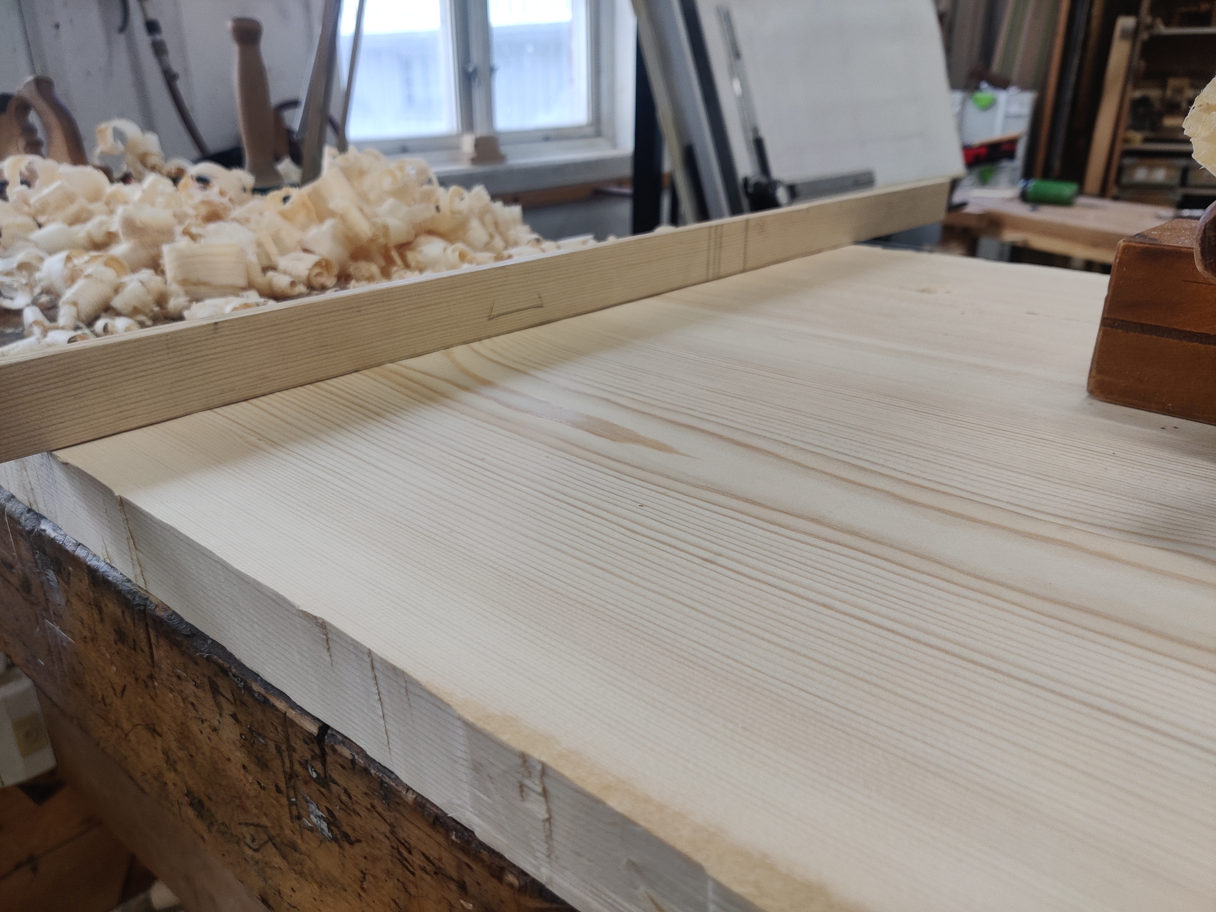 Pluggene ble kappet og pusset over med støthøvel. Sammenføyningene ble også ren-skjært og ujevnheter ble høvlet vekk før jeg til slutt tilpasset ramma inn i karmen.