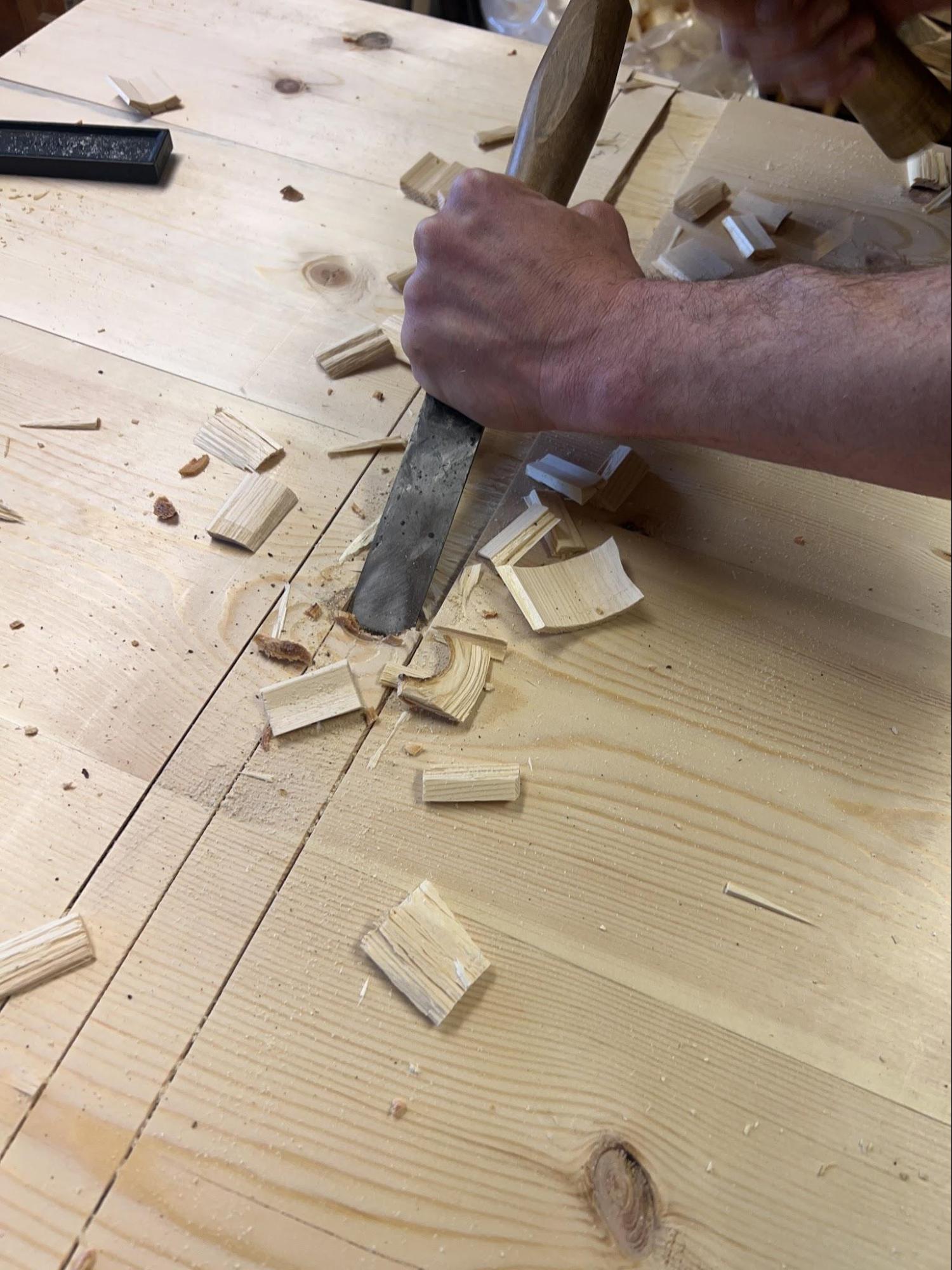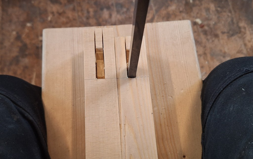 Neste steg var å tappe vekk slissen og å tappe ut tapphullet for sprossa. Dette gjorde jeg med en 8 mm lockbeitel. Arbeidet gjorde jeg på en sittebenk. Jeg la ned begge side-ramtreene og satt på dem mens jeg tappet. Dette var overaskende effektivt! Se bilde under.