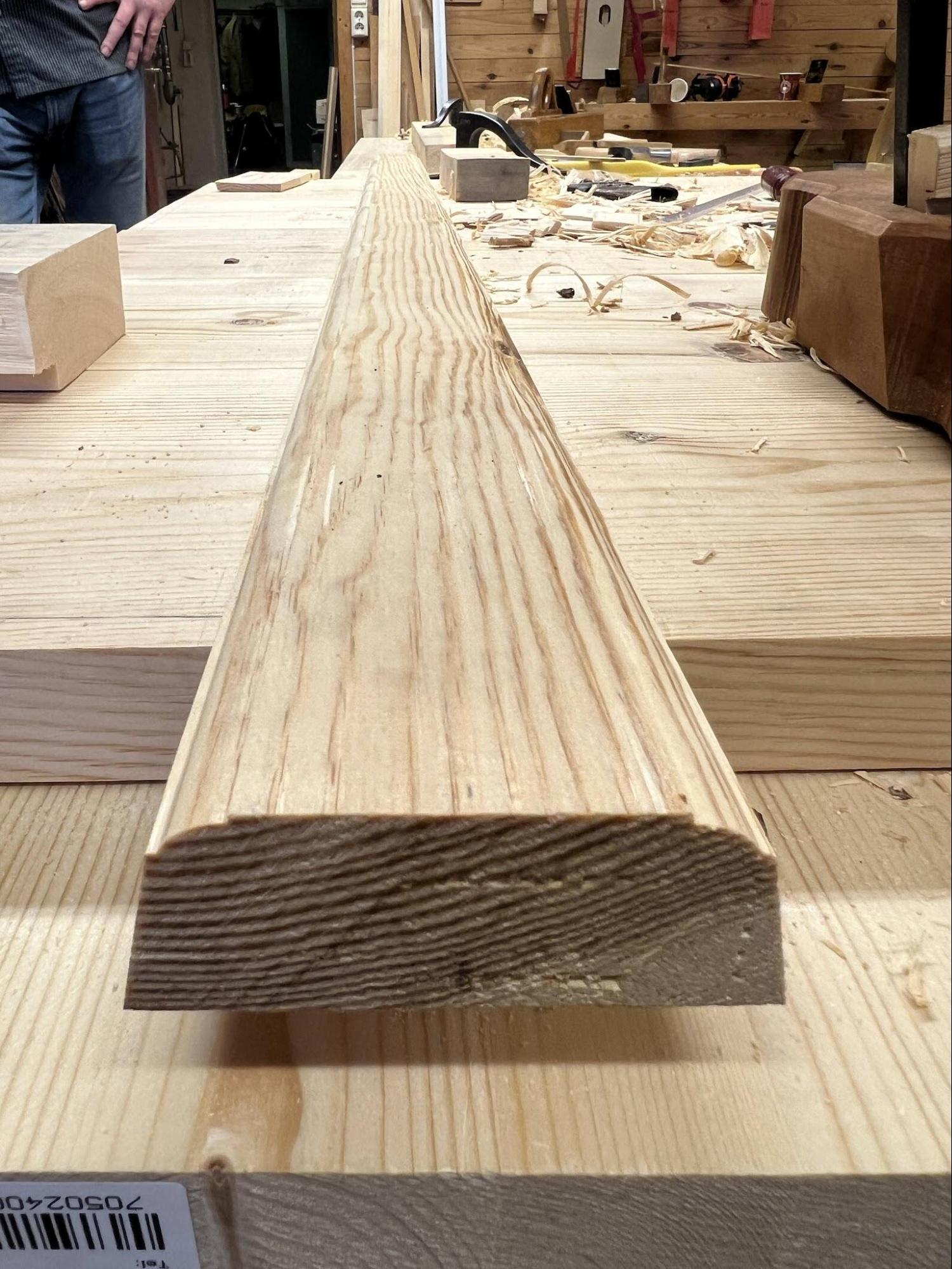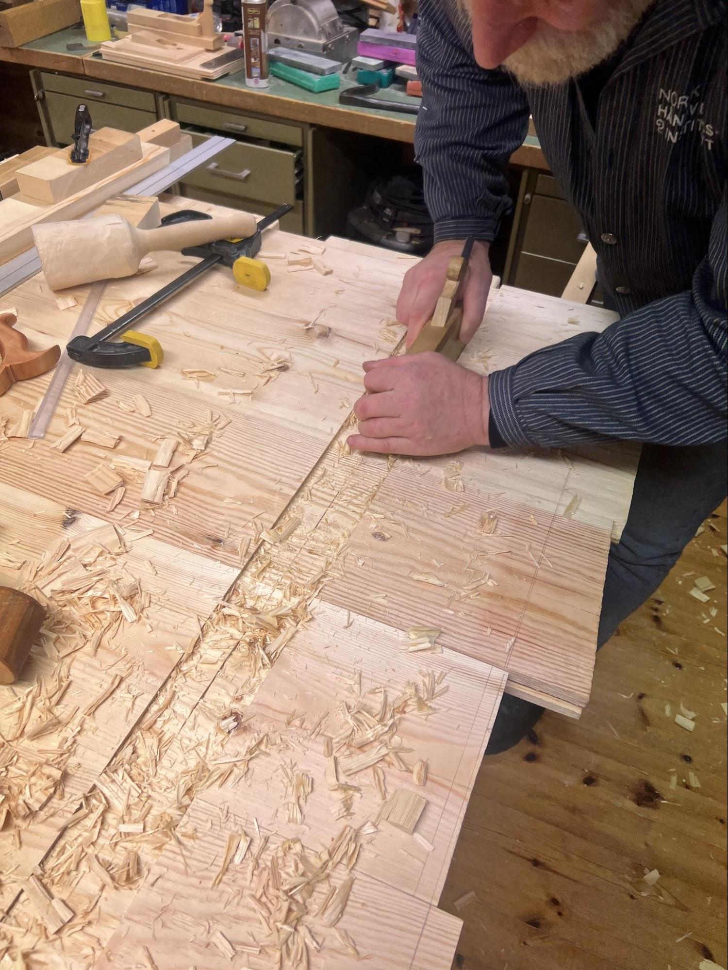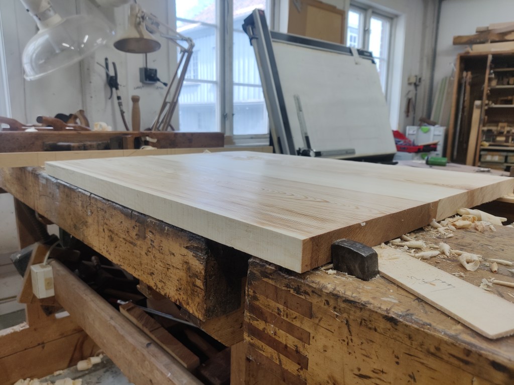 For å få emnene til å ligge godt, så lagde vi oss et «høvelbrett» som emnene lå godt nedi. Dette var spesielt nødvendig for å få sprossene til å ligge godt. Vi brukte «morhøvelen» til glashøvelen for å høvle en kontraprofil i brettet som sprossene lå godt nedi. Høvelbrettet hadde også dybdestopp for profilsiden av sprossa slik at den ikke ble skjevt høvlet.
