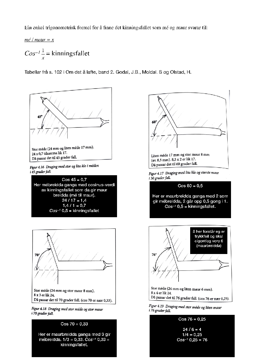 Med kalkulator tek vi moderne hjelpemiddel i bruk og eg har ikkje klart å komme fram til ein enklare måte å rekne ut kinningsfallet ifrå eit forhald mé- og maurbreidde, ved hjelp av hovudrekning. Våre forgjengarar som lafta hadde ikkje moderne kalkulator i lomma, og kanskje ikkje kunnskapen til å rekne trigonometri, utan at eg vil anta noko om kva dei visste og ikkje visste. Uansett meiner eg at fortidas utstrakte bruk av mé og maur synar, om ikkje ei uttalt så, ei ibuande forståing av trigonometri i tillegg til ei solid forståing av det levande materialet og bygningsmekanikk.
