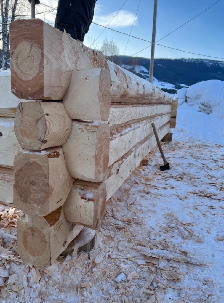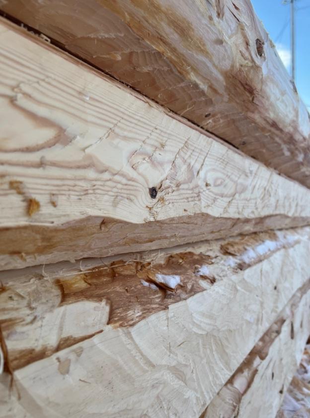 Ein tilnærma kopi av hønsehuset: Vi har hatt visse fridomar i utføringa og tilpassing for ny bruk. Dei første to kvarva vart rydd og hogd, men i same dimensjon og med same barke som på referansebygget. Vi har derfor også fått anledning til å prøve ut oppmerkingsverktøy ulike tilnærmingar i tømringa av dette bygget. Her står huset snart klart for heil lengde over dør og vindaugsopningar.