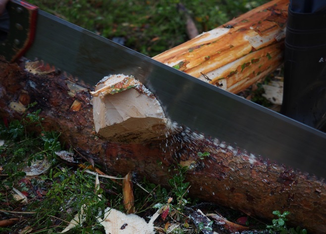 Next Image Emnet legges opp på underlagsstokken, og reinskjæres med en tømmersvans. Emnet legges opp på underlagsstokken, og reinskjæres med en tømmersvans. Foto: Åge Emil Bergquist Lik Lastar …
